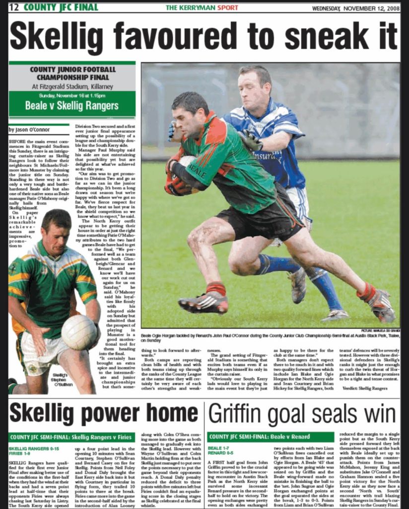 Skellig Rangers have qualified for their first ever Junior Final after making better use of the conditions in the first-half when they had the wind at their backs and had a seven point lead at half-time that their opponents Firies were always chasing last Saturday in Listry. The South Kerry side opened up a four point lead in the opening 10 minutes with Sean Courtney,Stephen O Sullivan and Bernard Casey on fire for Skellig. Points from Neil Foley and Donal Daly brought the East Kerry side back into it but with Courtney in particular in flying form, they trailed 10 points to three at the break. Firies came more into the game in the second-half aided by introduction of Alan Lonney along with Colm O’Shea coming more into the game as both managed to gradually eek into the Skellig lead. However with Wayne O’Sullivan and Colm Martin holding firm at the back Skellig just managed to put over the points necessary to put the game beyond their opponents reach. A Donal Daly penalty reduced the deficit to three points with five minutes left but Firies couldn’t find an equalizing score in the closing stages as Skellig celebrated at the final whistle.