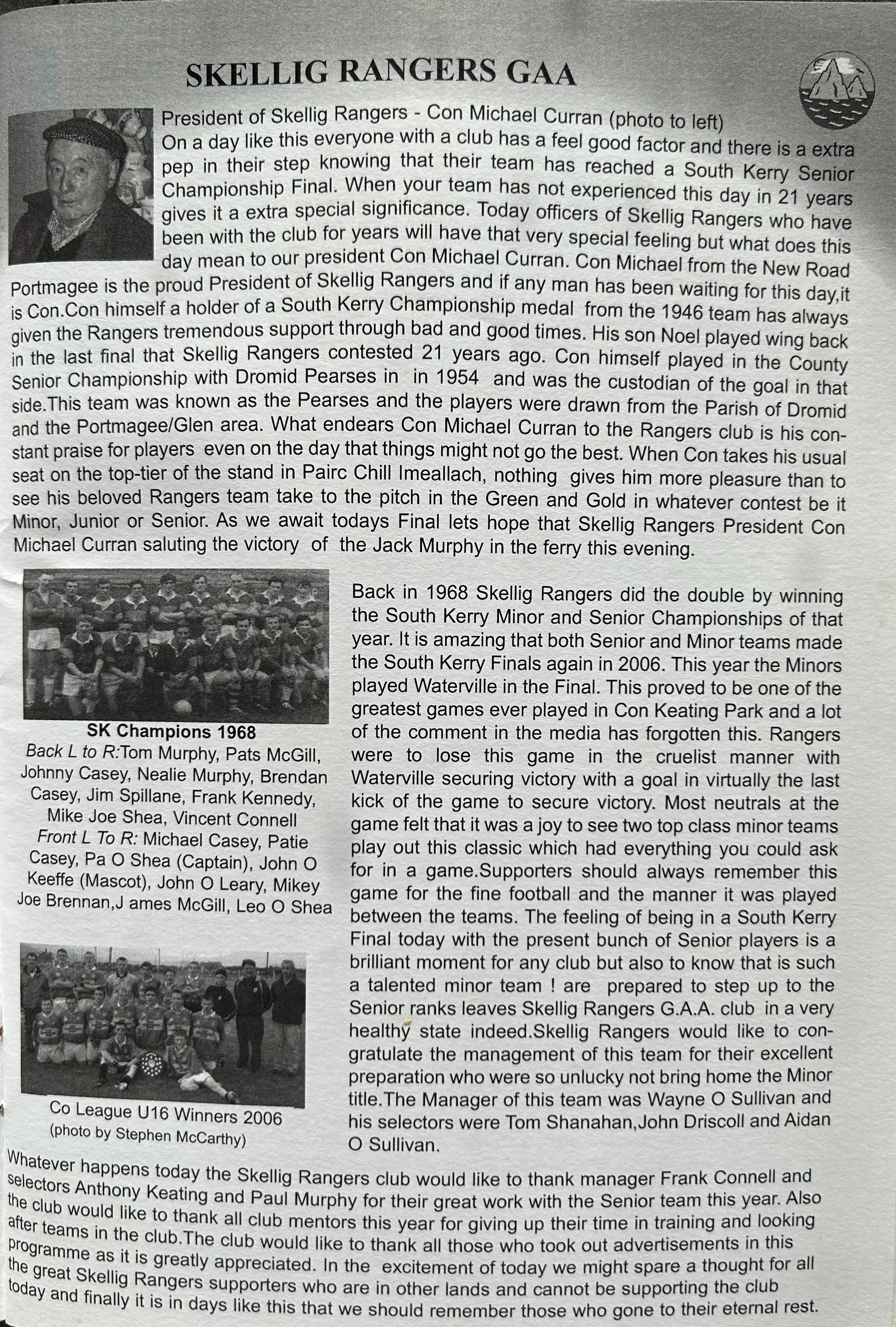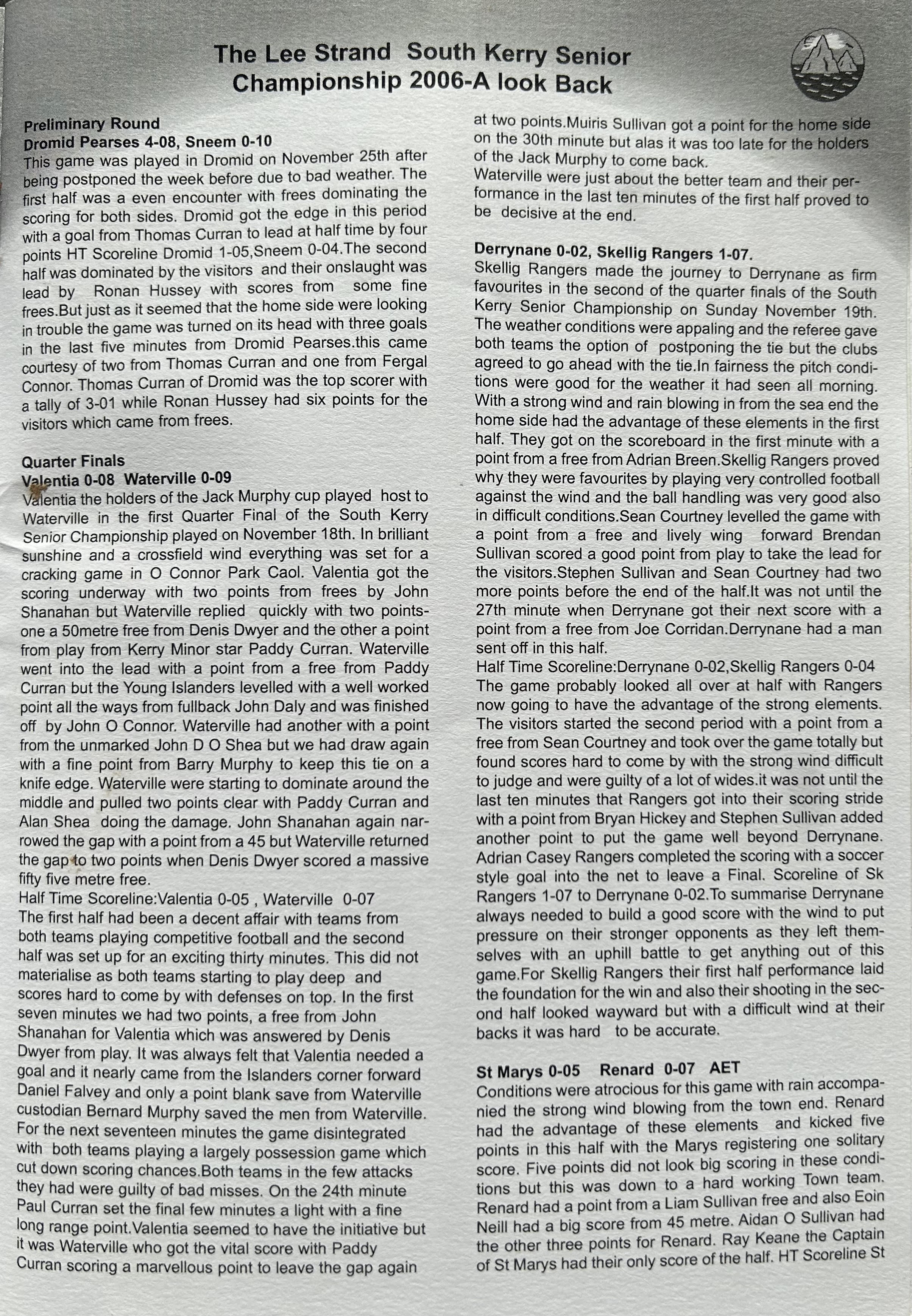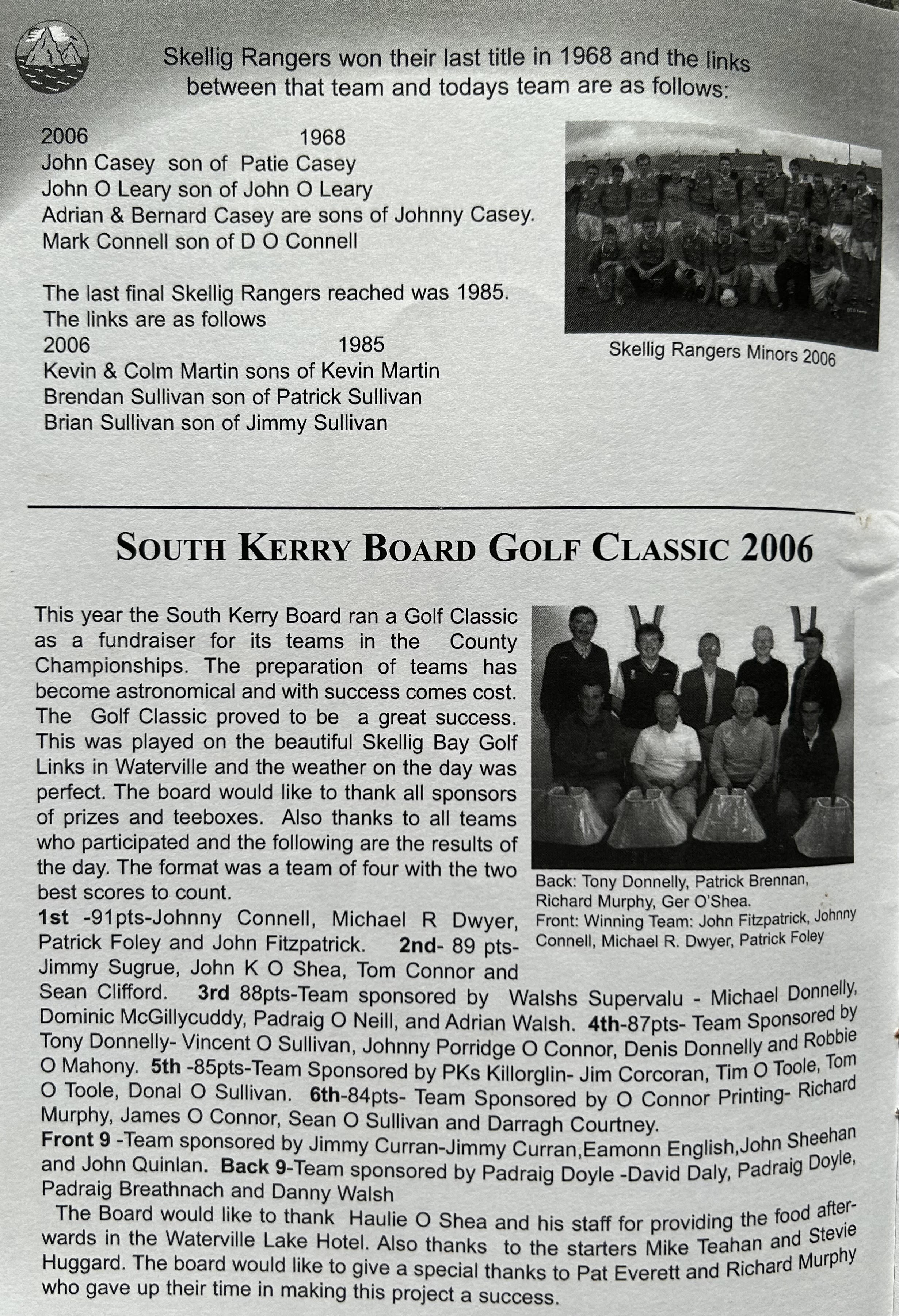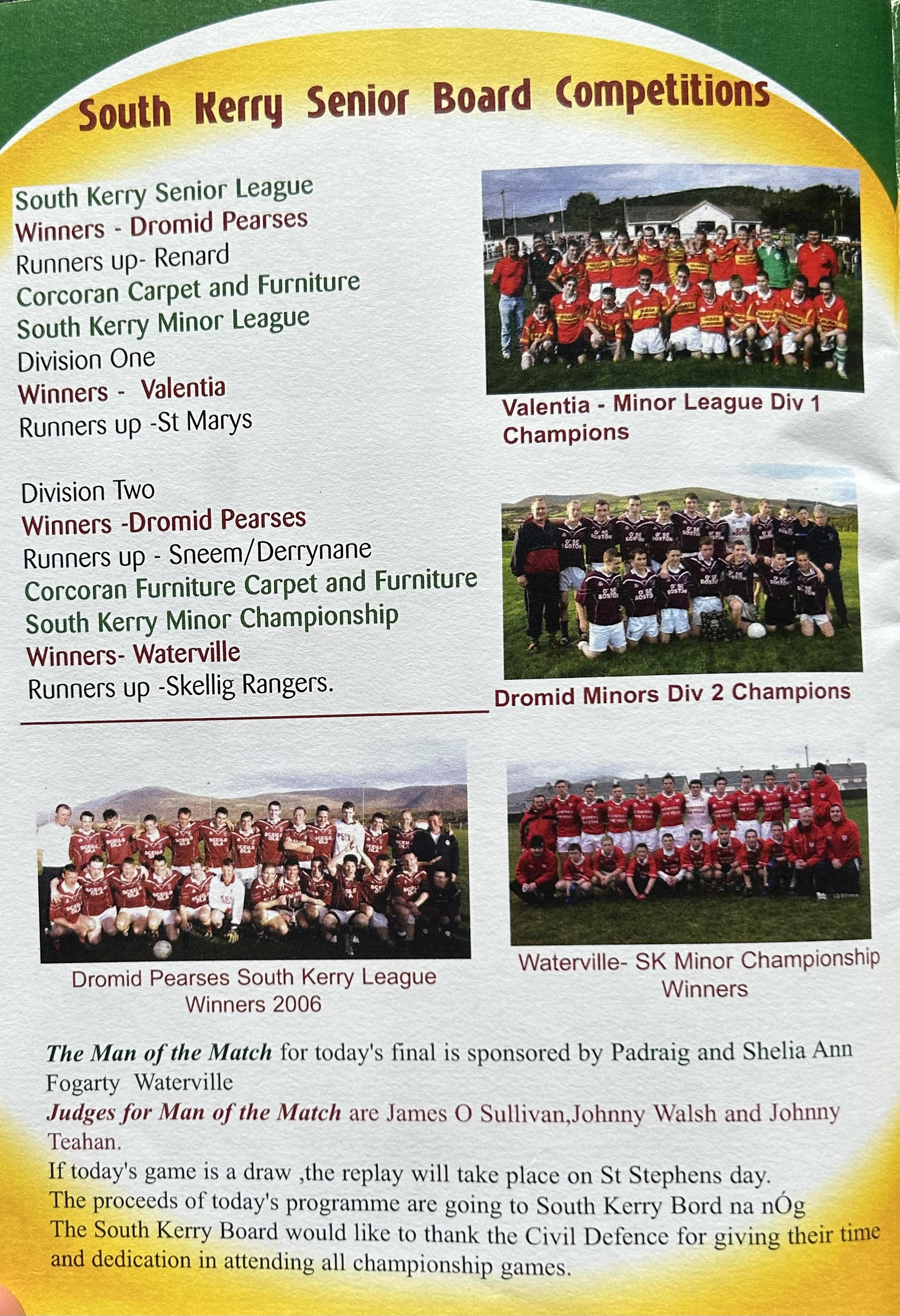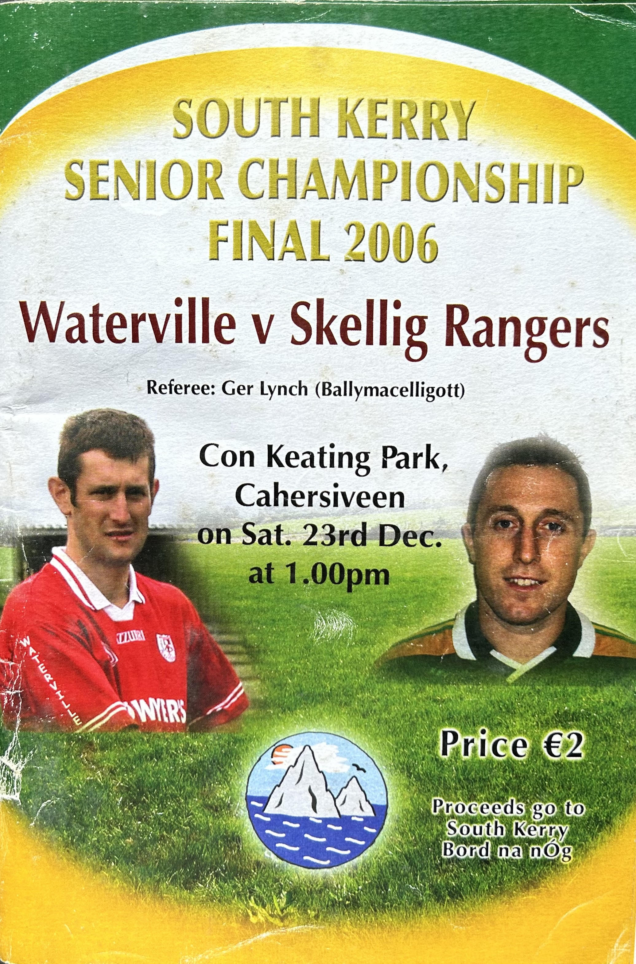 But when Waterville hit four second period wides, including a long-range effort from Curran whose tally over the two games reached 1-10 – with the final kick of the game, Waterville knew it wasn’t going to be their day and Skellig Rangers were crowned South Kerry senior football champions for 2006.