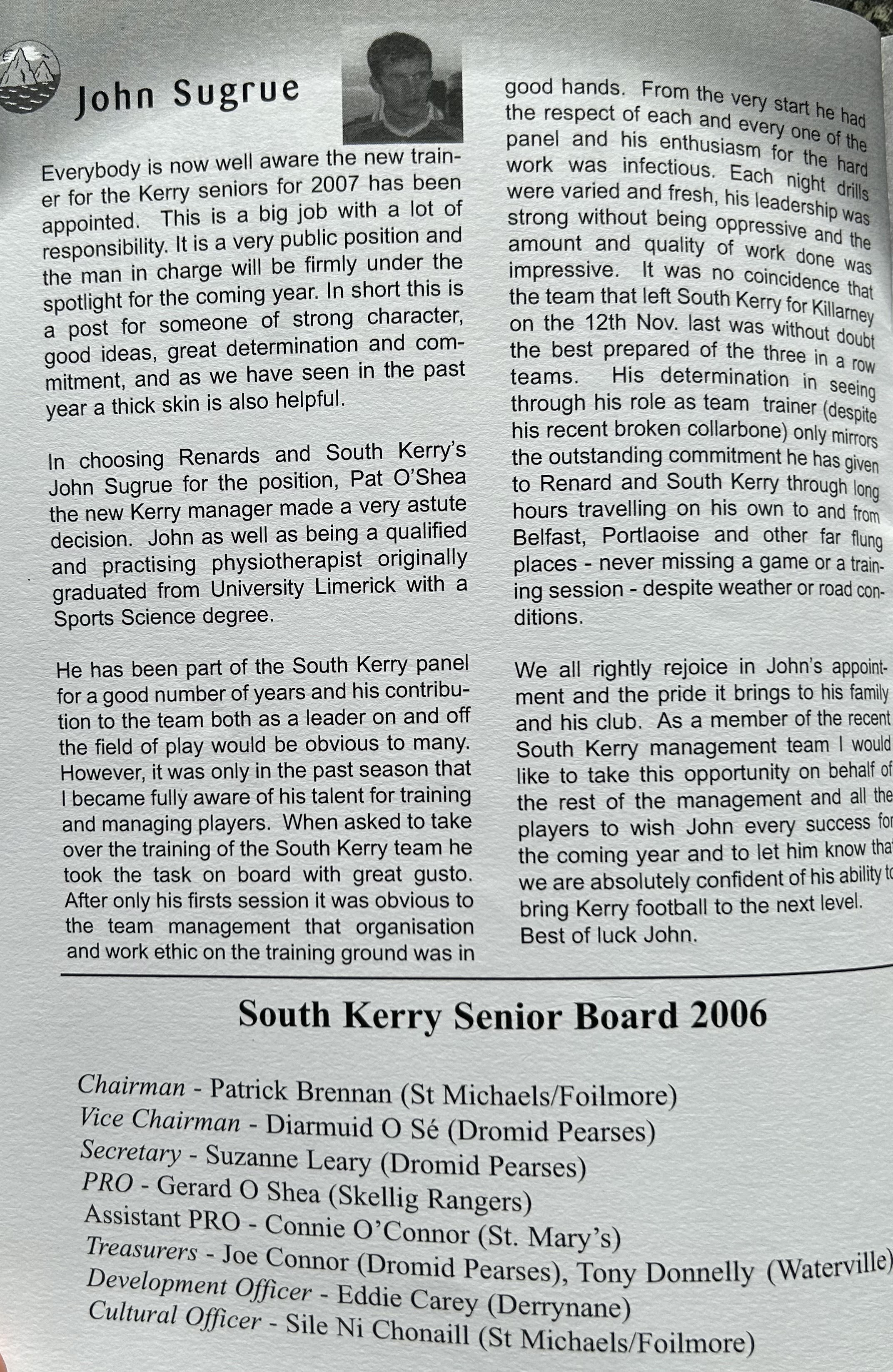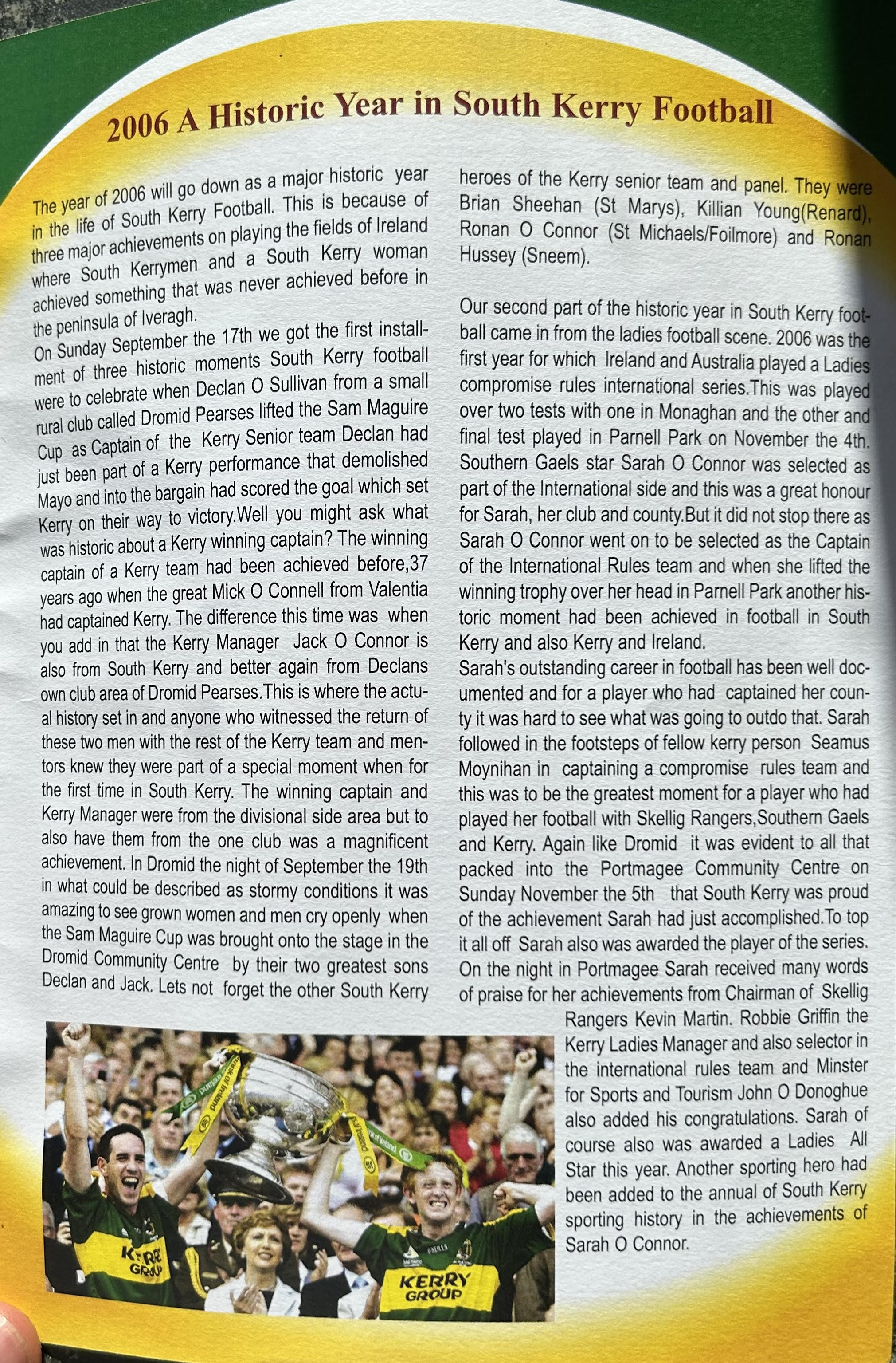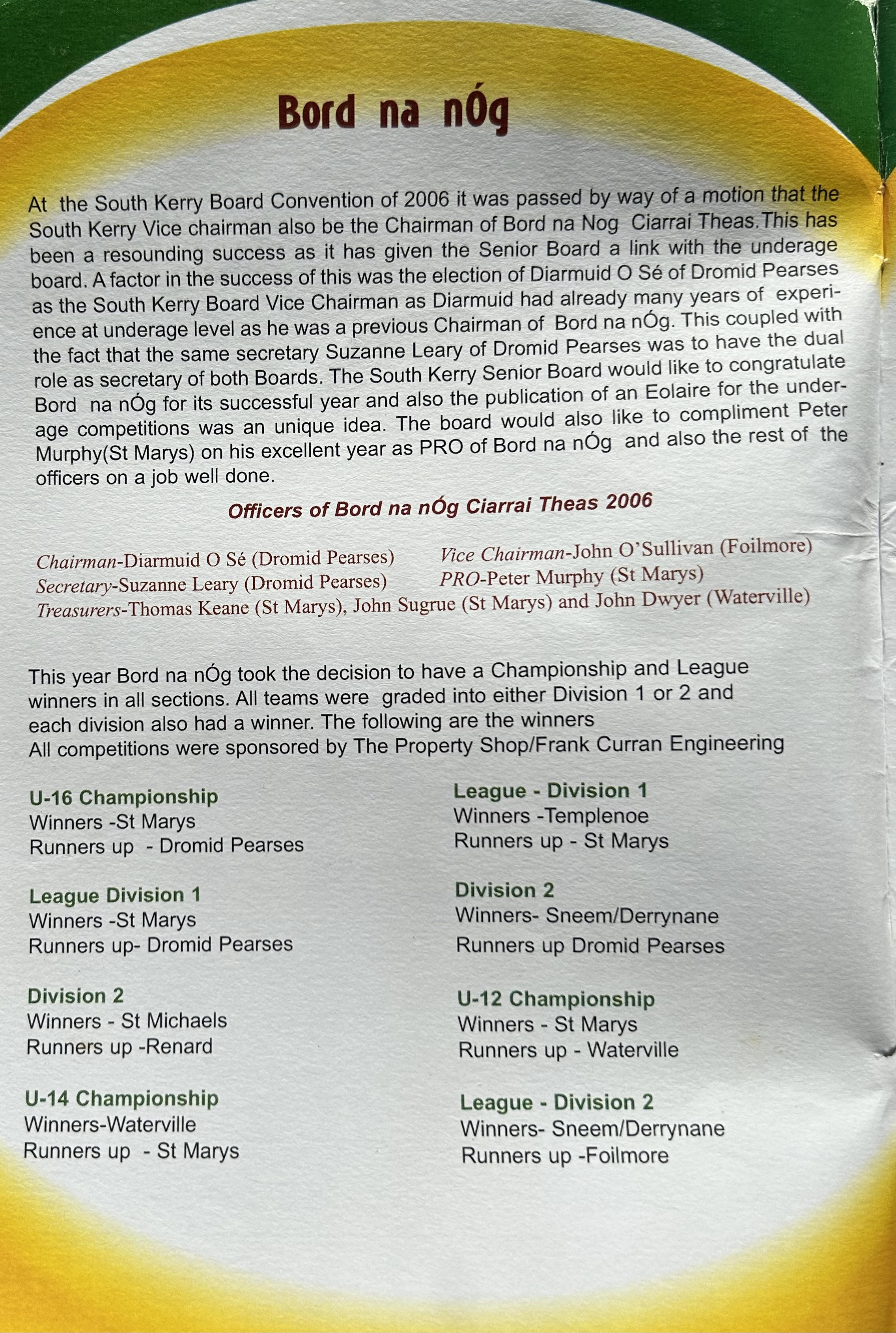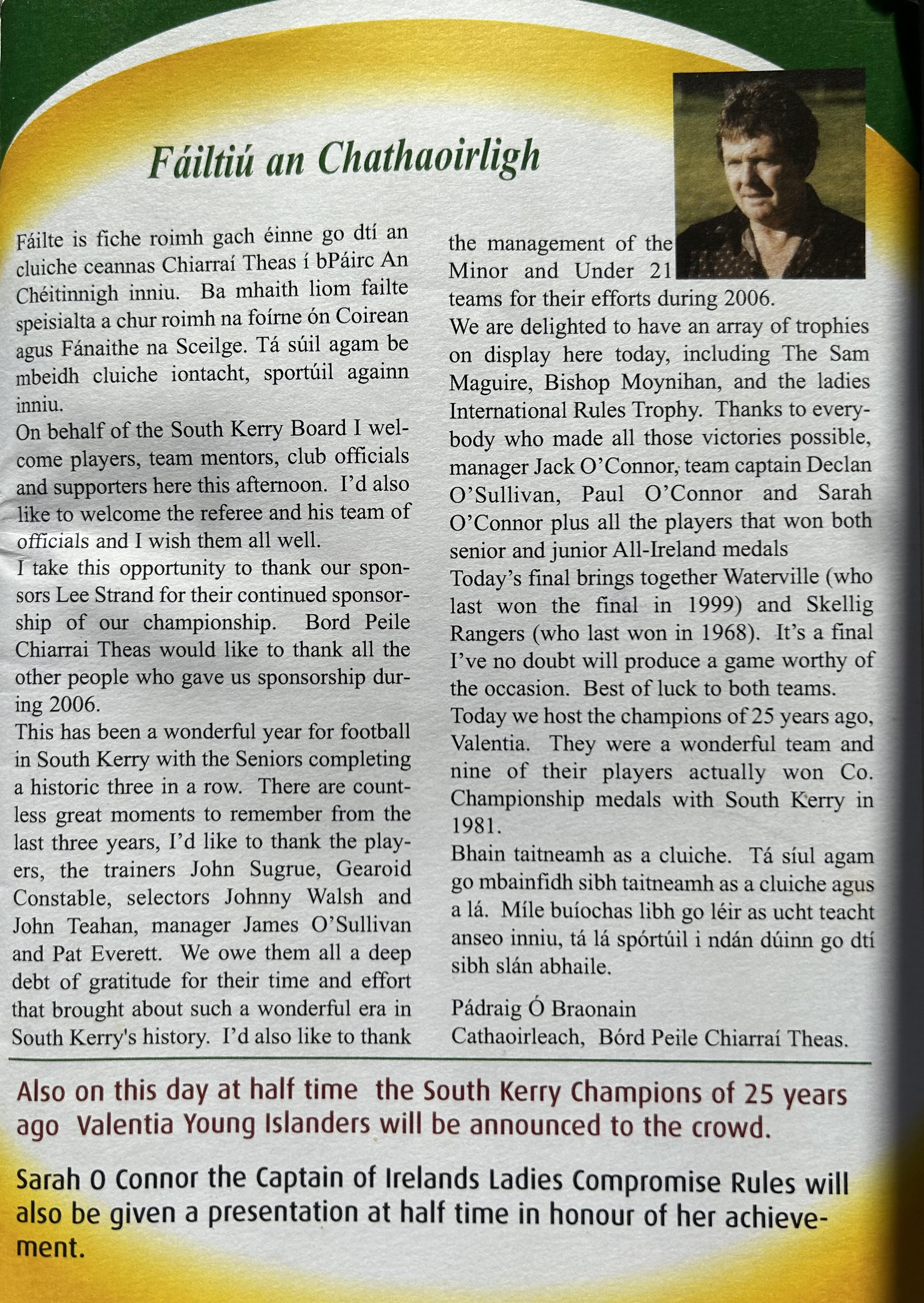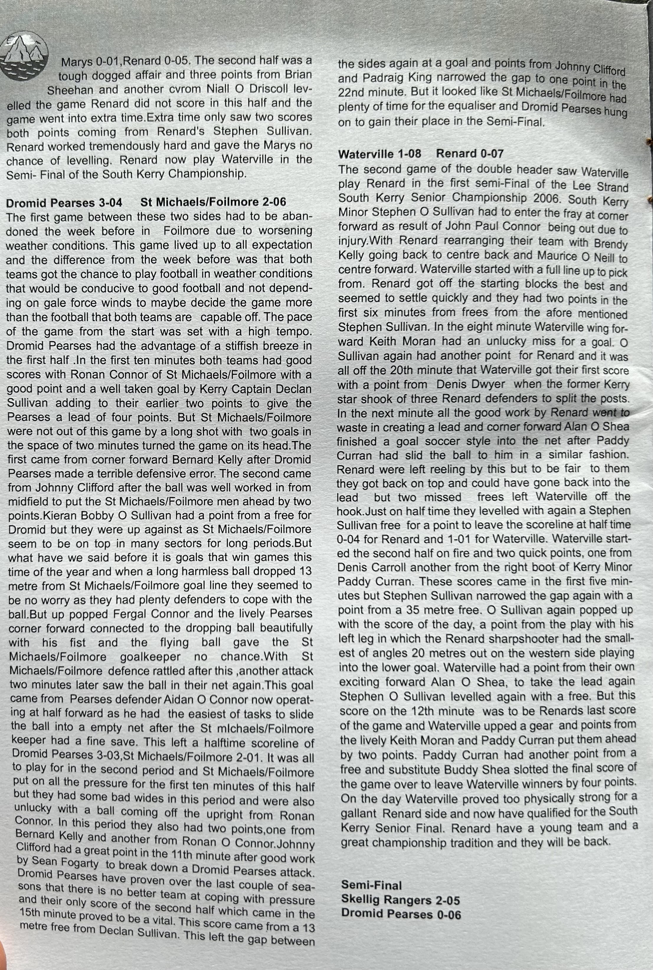 But when Waterville hit four second period wides, including a long-range effort from Curran whose tally over the two games reached 1-10 – with the final kick of the game, Waterville knew it wasn’t going to be their day and Skellig Rangers were crowned South Kerry senior football champions for 2006.