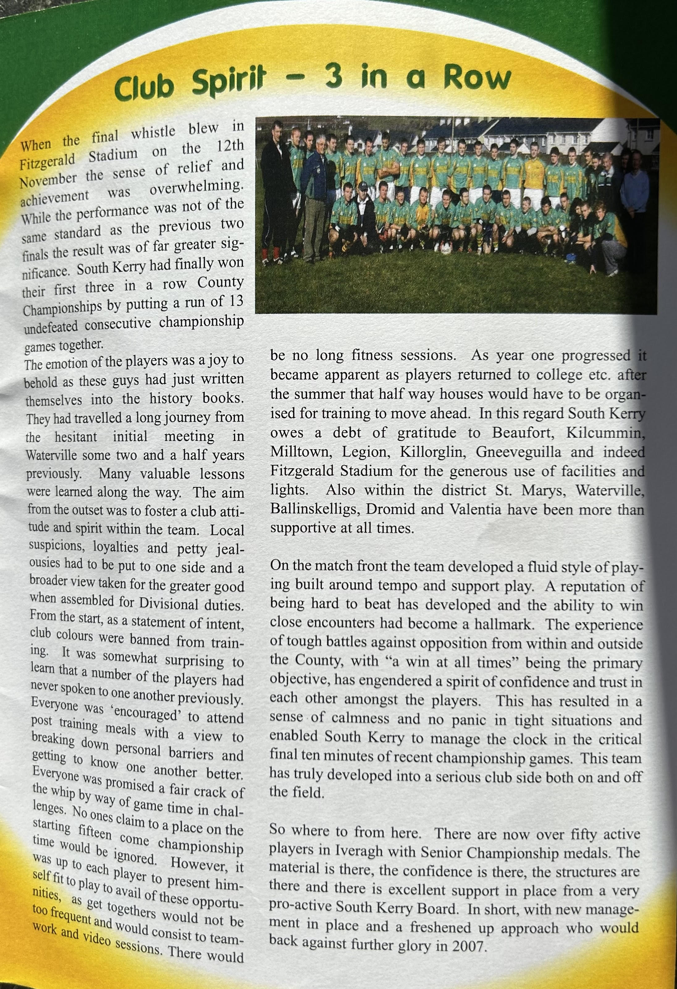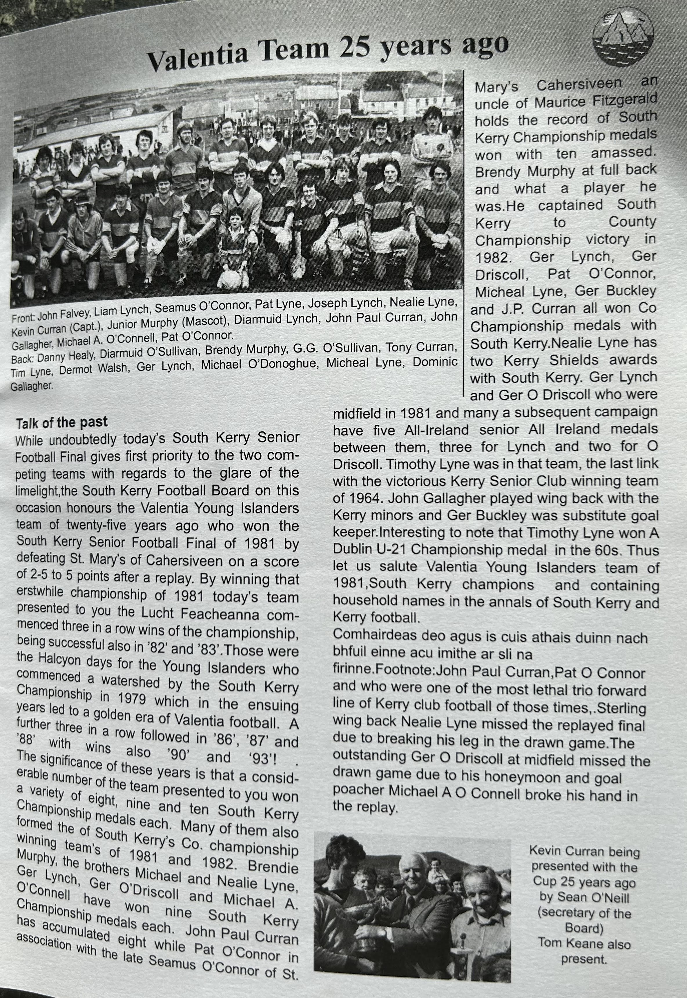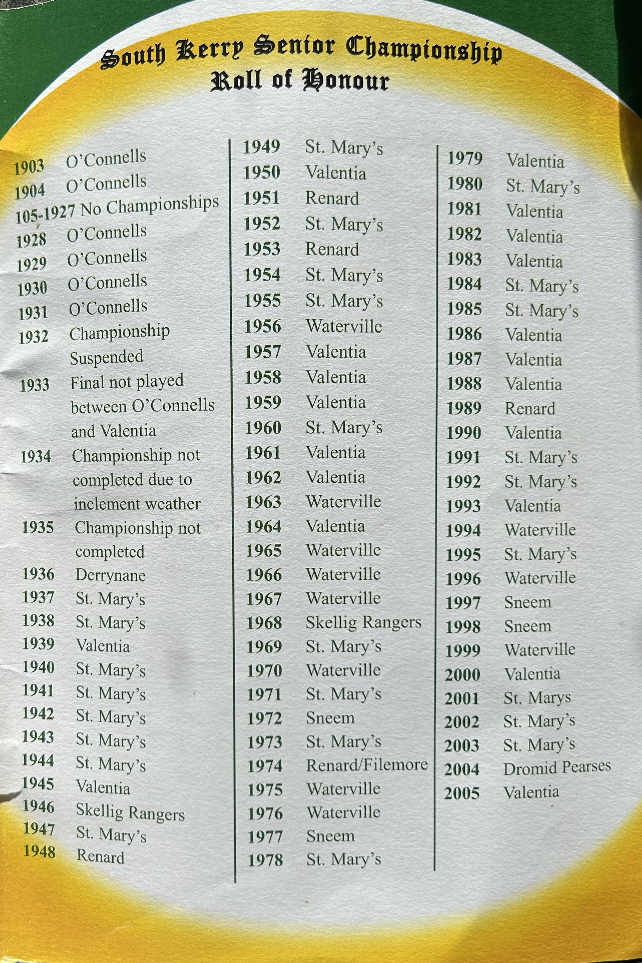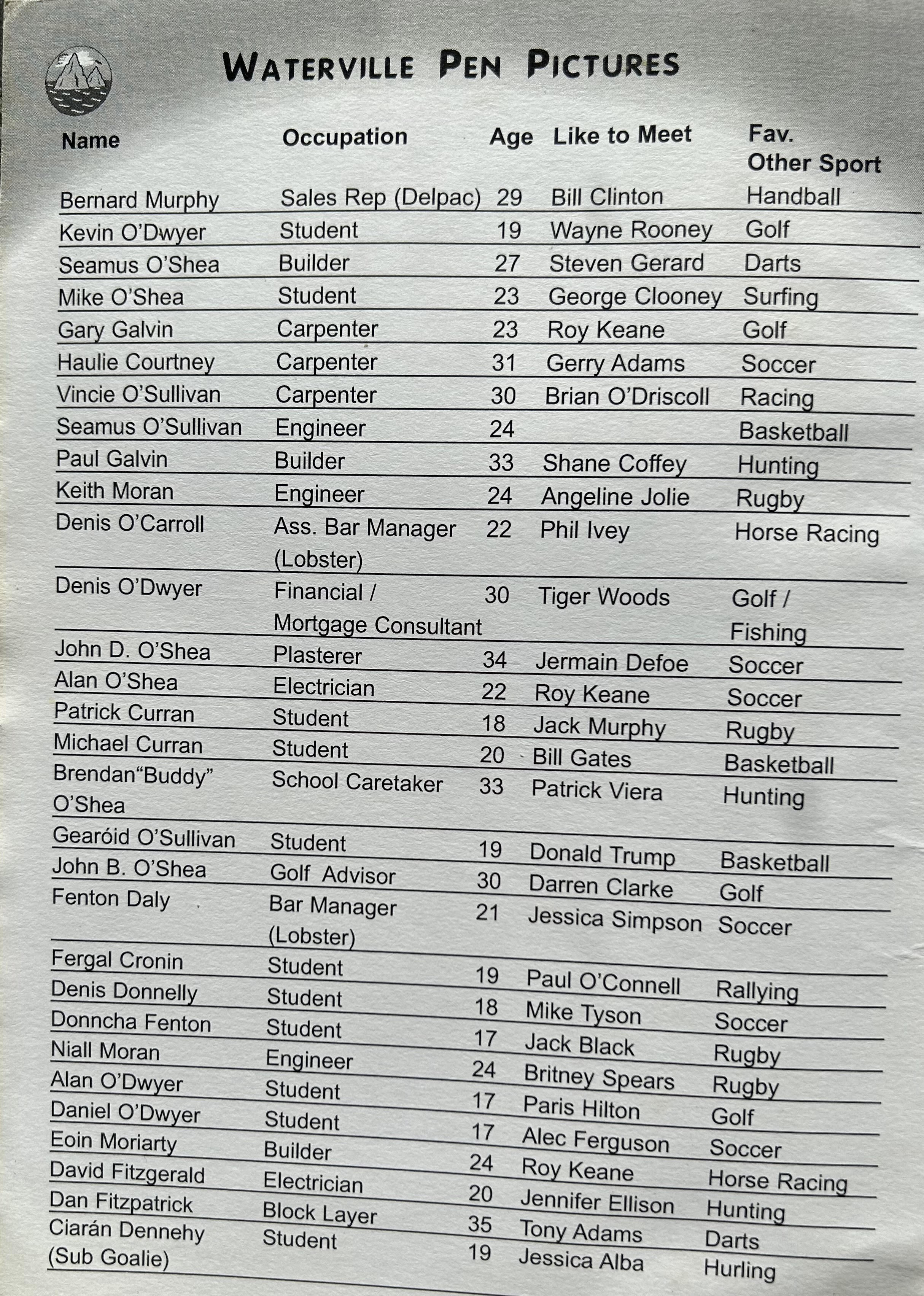 WATERVILLE: Bernard Murphy, Kevin 0’Dwyer, Seamus O’Shea, Mike O’Shea, Gary Galvin, Haulie Courtney, Vince Sullivan, Seamus O’Sullivan, Paul Galvin, Martin Curran, Denis ‘Carroll, Gearoid O’Sullivan, Patrick Curran, Denis 0’Dwyer, Alan O’Shea. Subs used: Brendan ‘Buddy’ O’Shea, Keith Moran, Denis Donnelly, John D O’Shea.