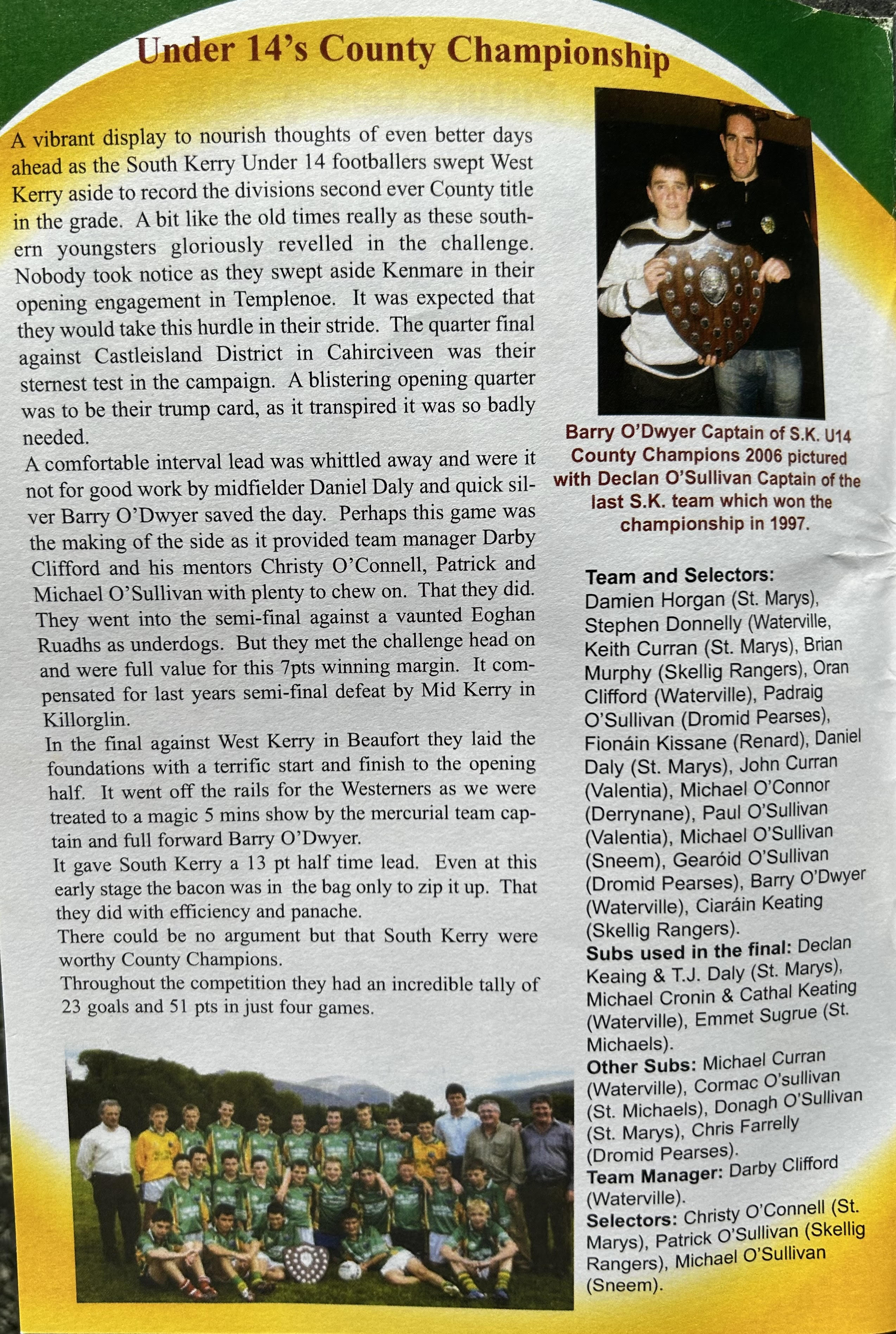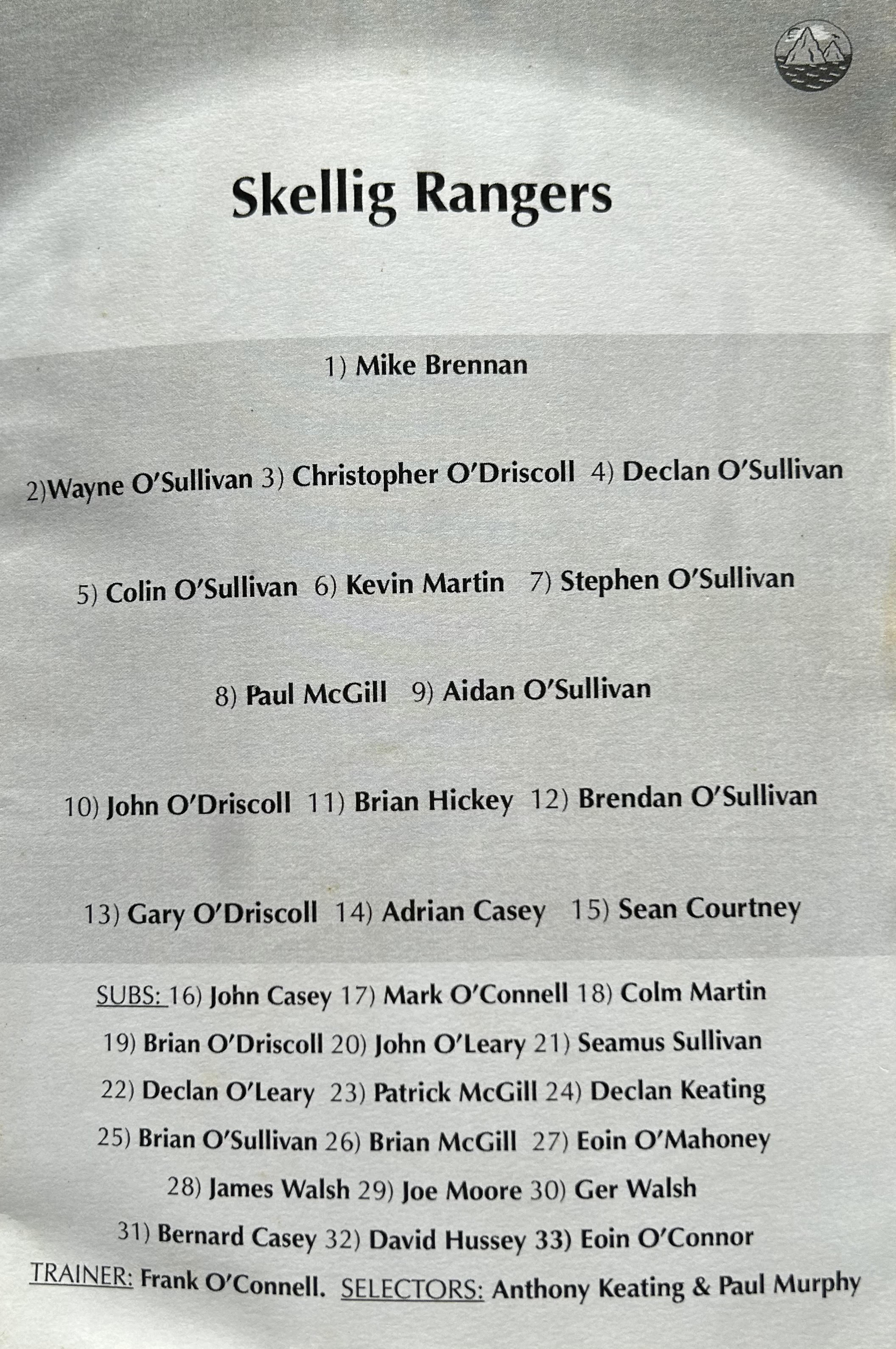 SKELLIG RANGERS: Mike Brennan, Wayne O’Sullivan, Stephen O’Sullivan, Colm Martin, Colin O’Sullivan, Kevin Martin, Mark O’Connell, Paul McGill, Aidan O’Sullivan, John 0’Driscoll, Brian Hickey, Christopher 0’Driscoll, Gary 0’Driscoll, Adrian Casey, Sean Courtney. Subs used: Declan O’Sullivan, Brendan O’Sullivan, Seamus Sullivan, John O’Leary.