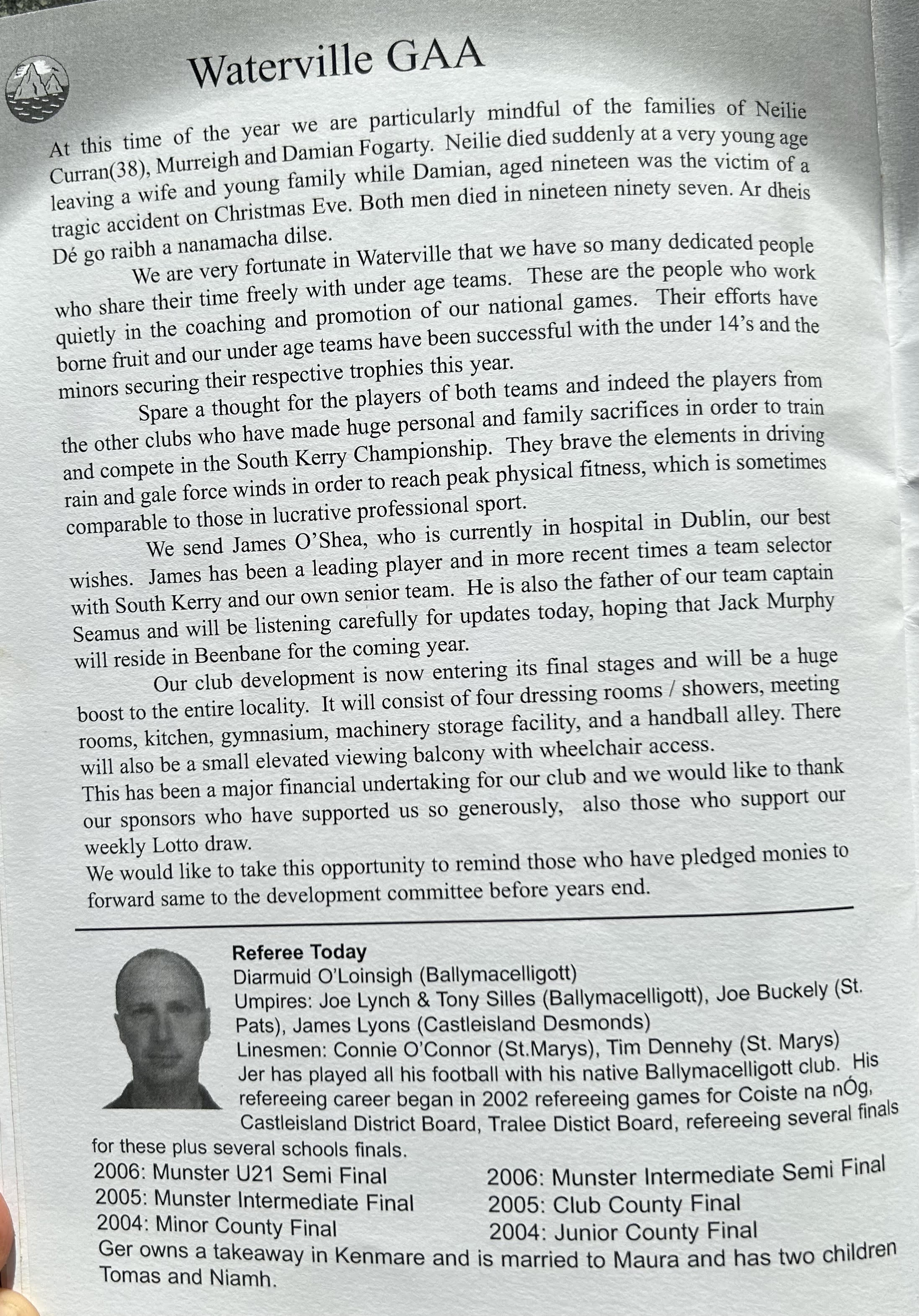 Centre forward is Brian Hickey, now they know he is a danger. Their centre back, will mark him tight, this powerful Skellig Ranger. Our minor Gary O ‘Driscoll, got speed and skill and tricks.He says Jack Murphy is in Santa’s bag, for Christmas zero six.