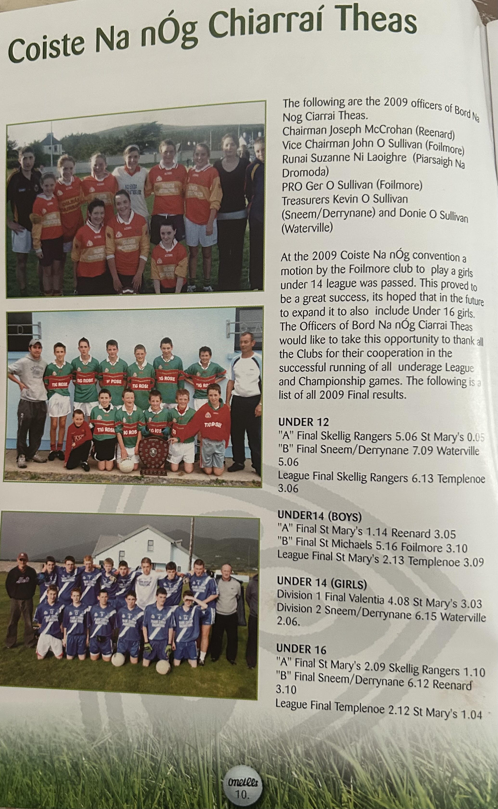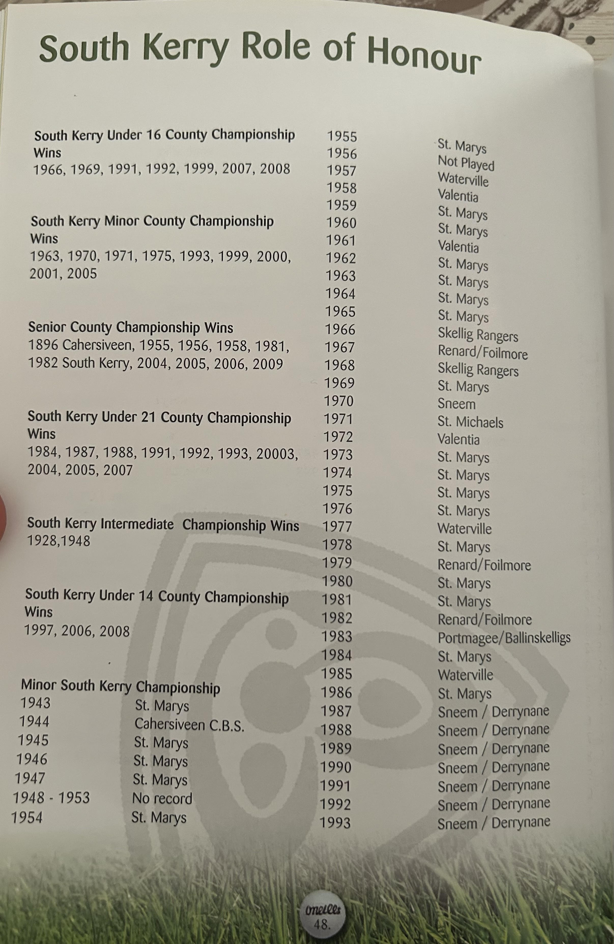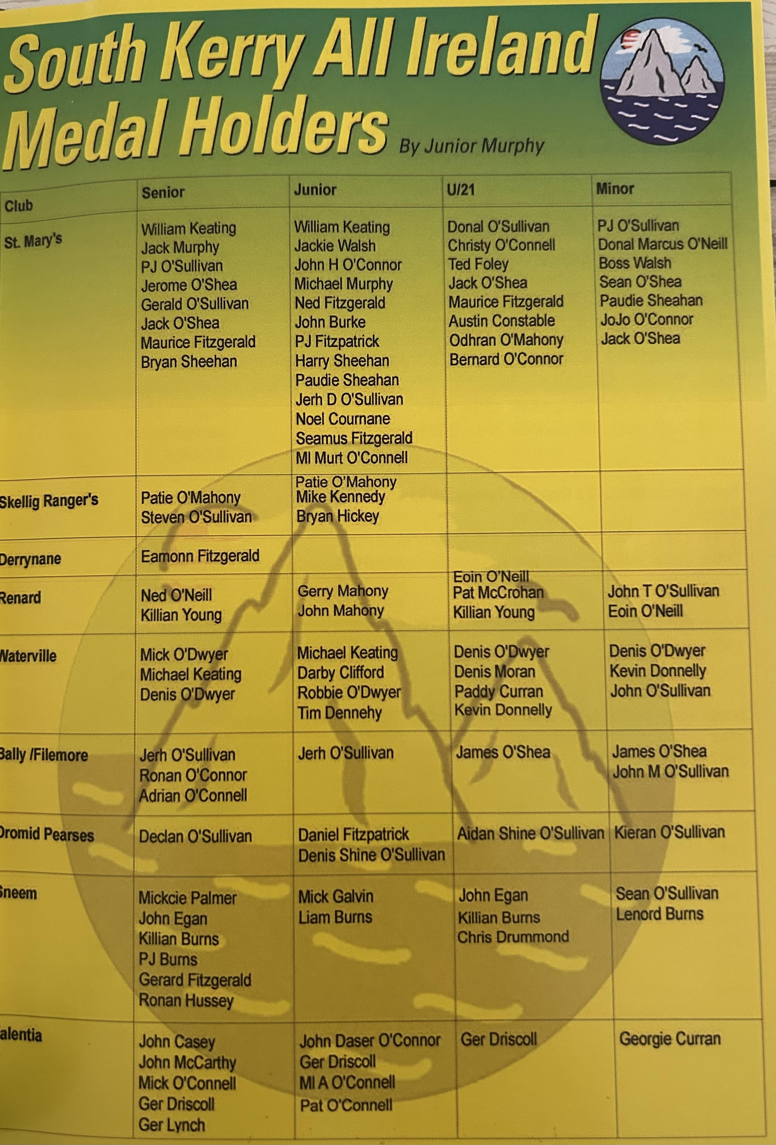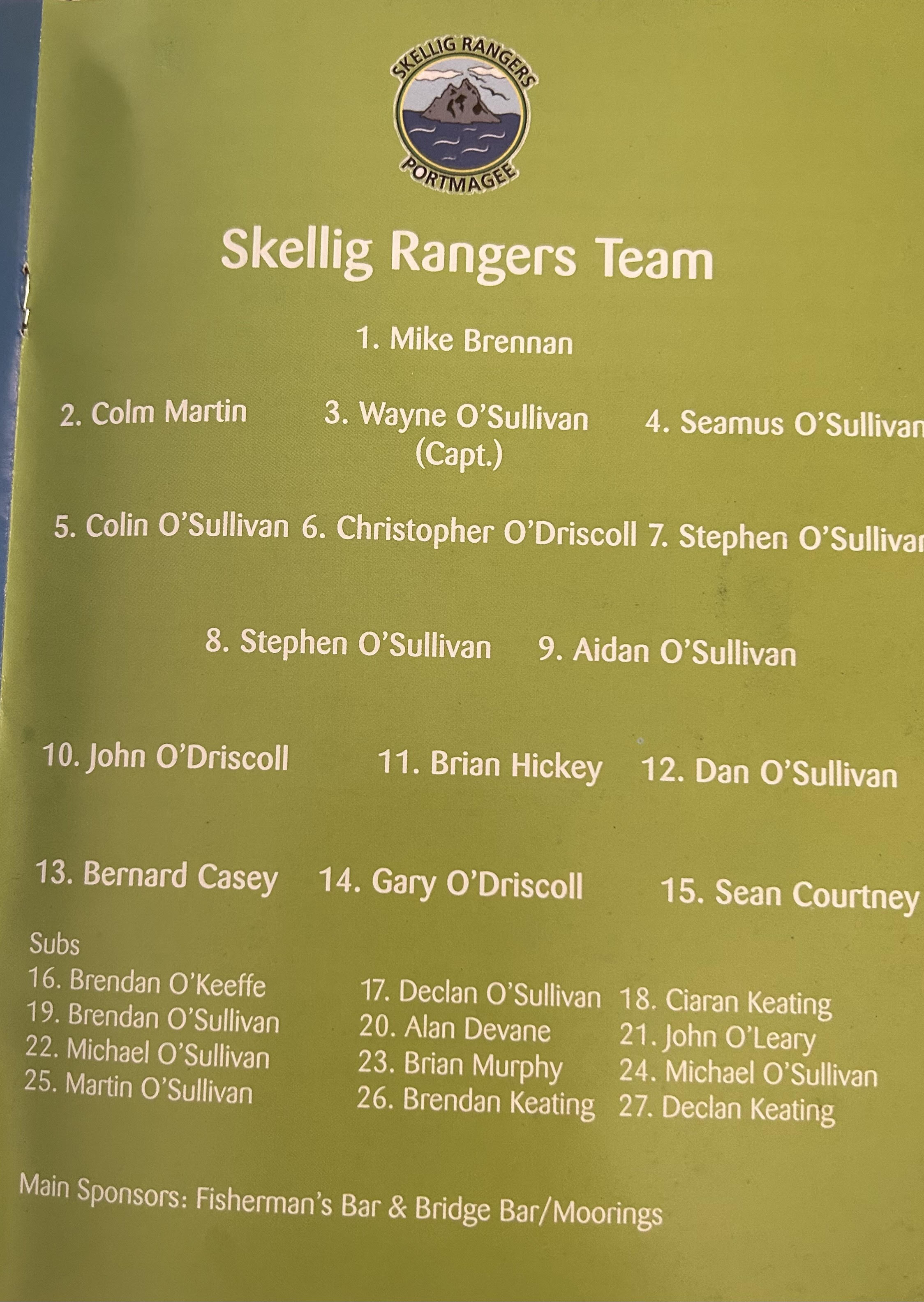 SKELLIG RANGERS: Mike Brennan, Colm Martin, Wayne O Sullivan, Seamus O Sullivan, Colin 0′ Sullivan(0-1). Christopher 0 Driscoll, Stephen L 0′ Sullivan, Stephen 0 Sulivan, Aidan 0 Sullivan (0. 1), John 0’Driscoll ,Brian Hickey ,Dan 0 Sullivan (0-2F) Bernard Casey (0- 1). Gary 0 Driscoll Sean Courtney (0-4,2F) Subs Ciaran Keating for Casey and Brendan 0′ Sullivan for John O Driscoll