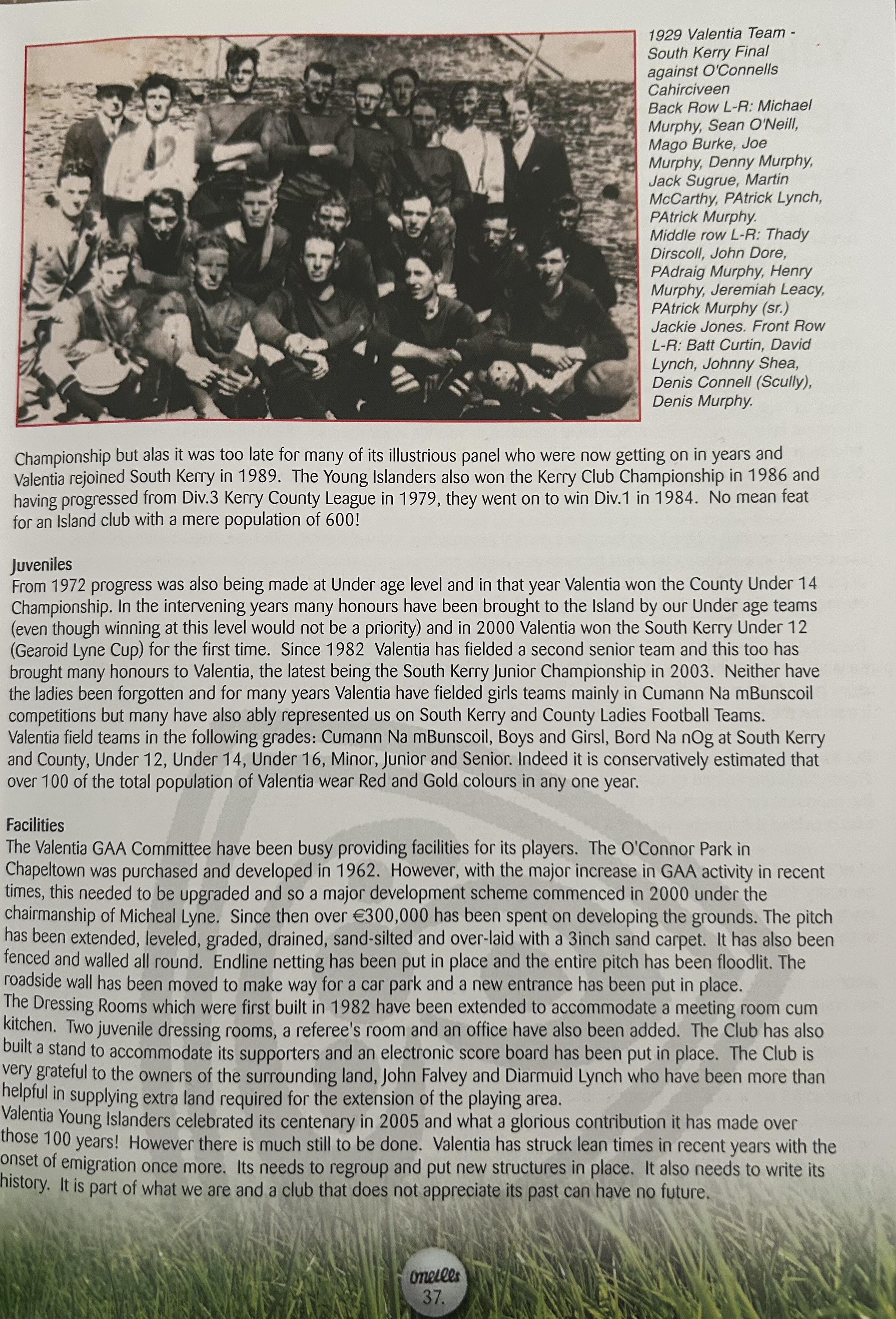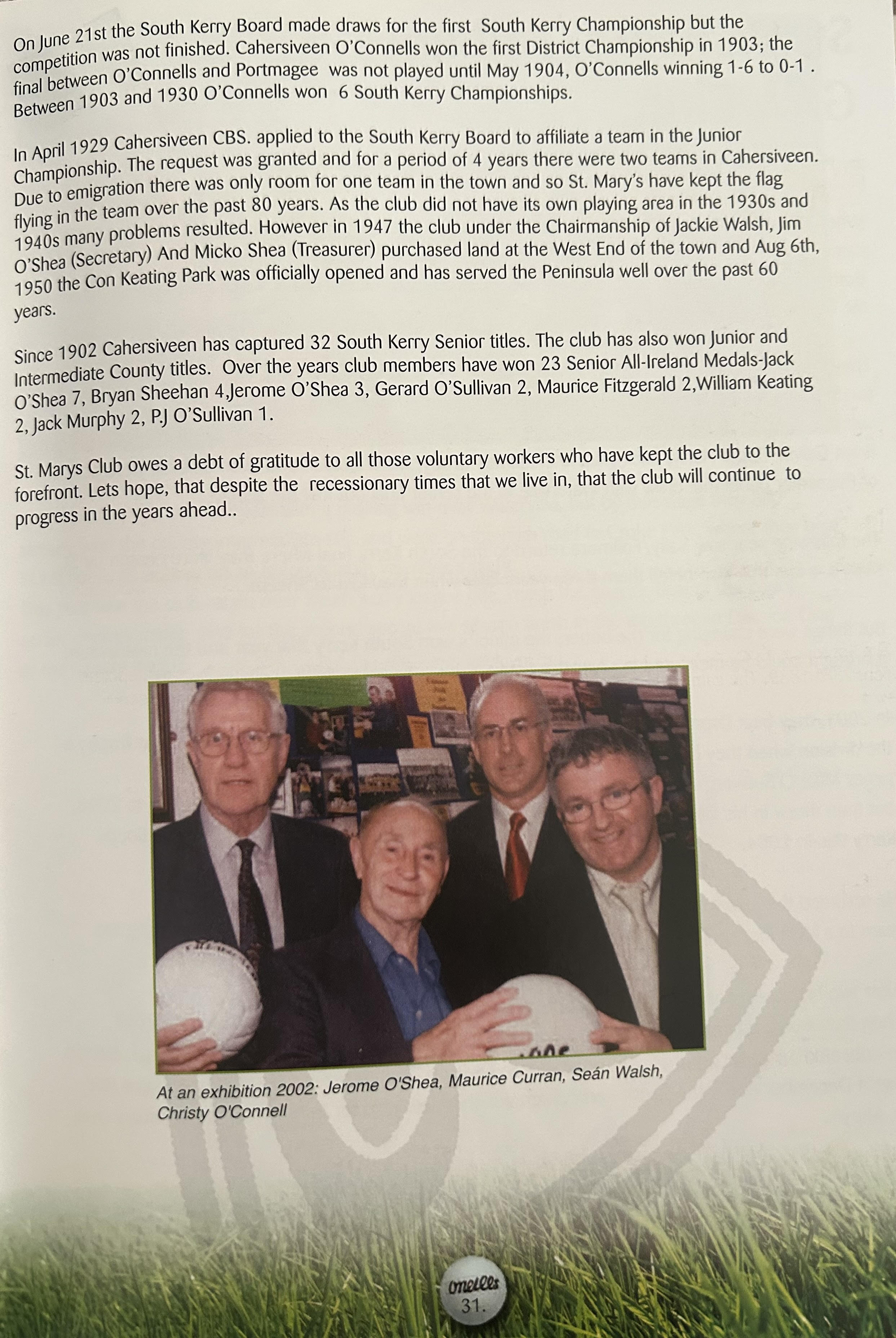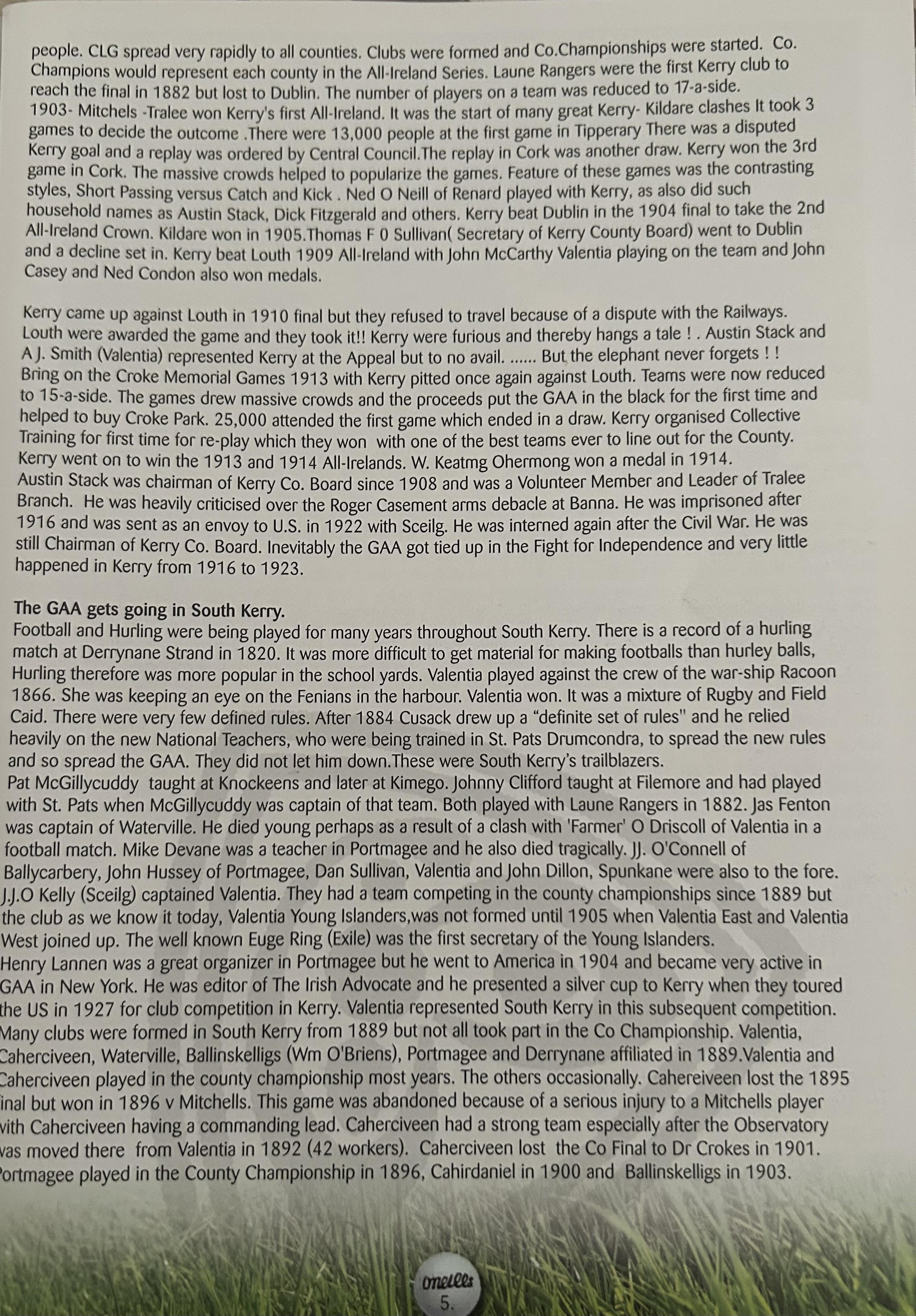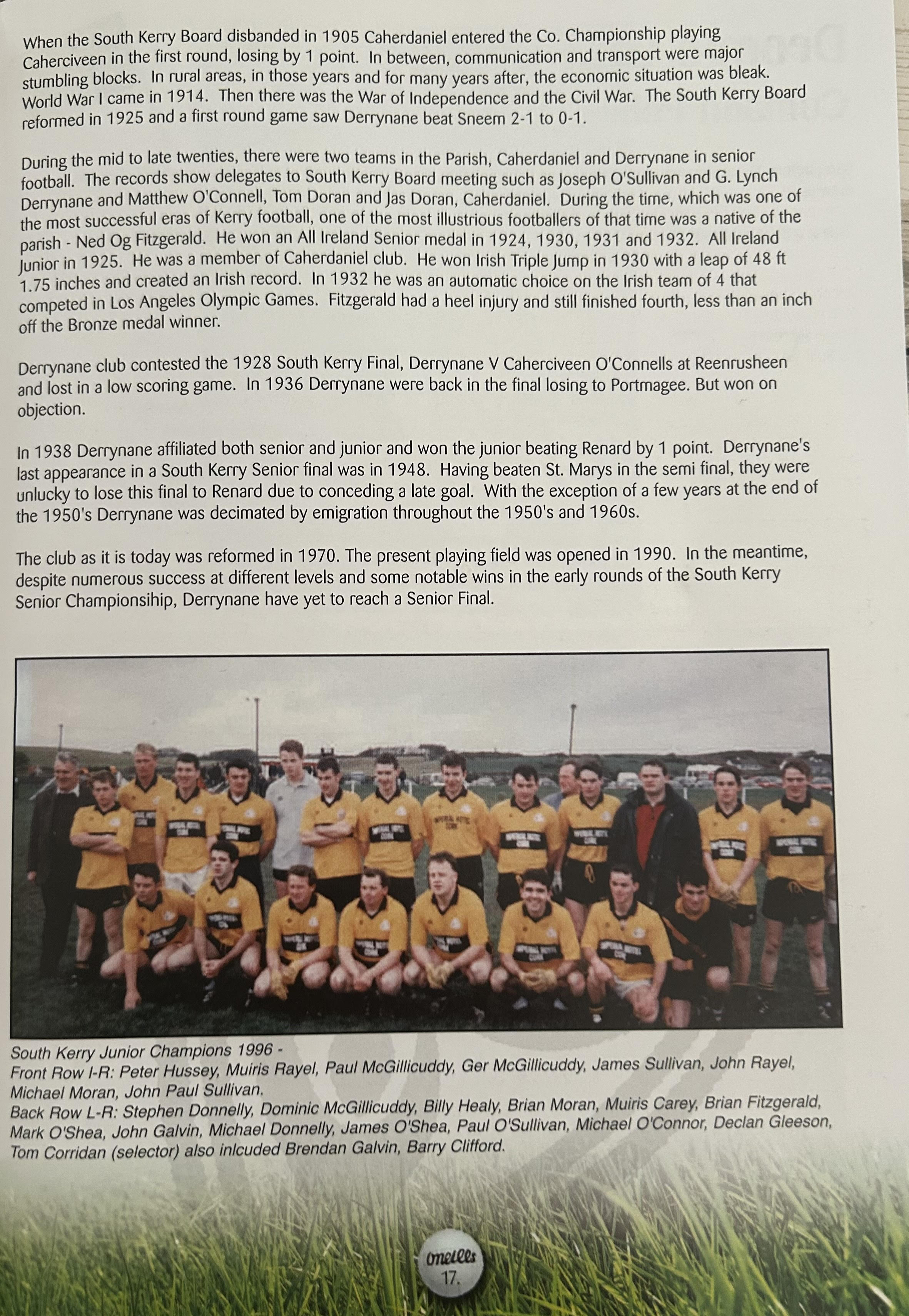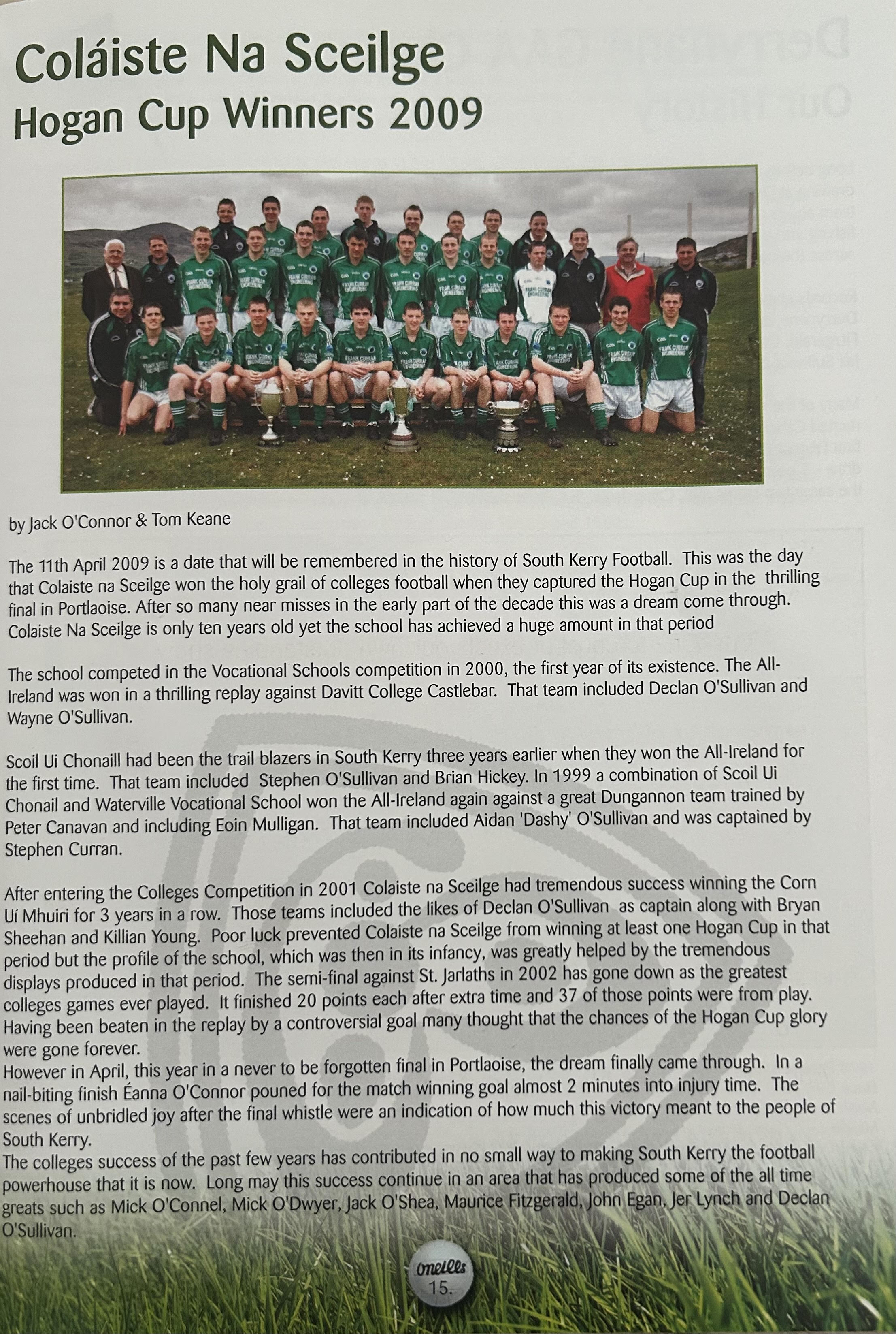 SKELLIG RANGERS: Mike Brennan, Colm Martin, Wayne O Sullivan, Seamus O Sullivan, Colin 0′ Sullivan(0-1). Christopher 0 Driscoll, Stephen L 0′ Sullivan, Stephen 0 Sulivan, Aidan 0 Sullivan (0. 1), John 0’Driscoll ,Brian Hickey ,Dan 0 Sullivan (0-2F) Bernard Casey (0- 1). Gary 0 Driscoll Sean Courtney (0-4,2F) Subs Ciaran Keating for Casey and Brendan 0′ Sullivan for John O Driscoll