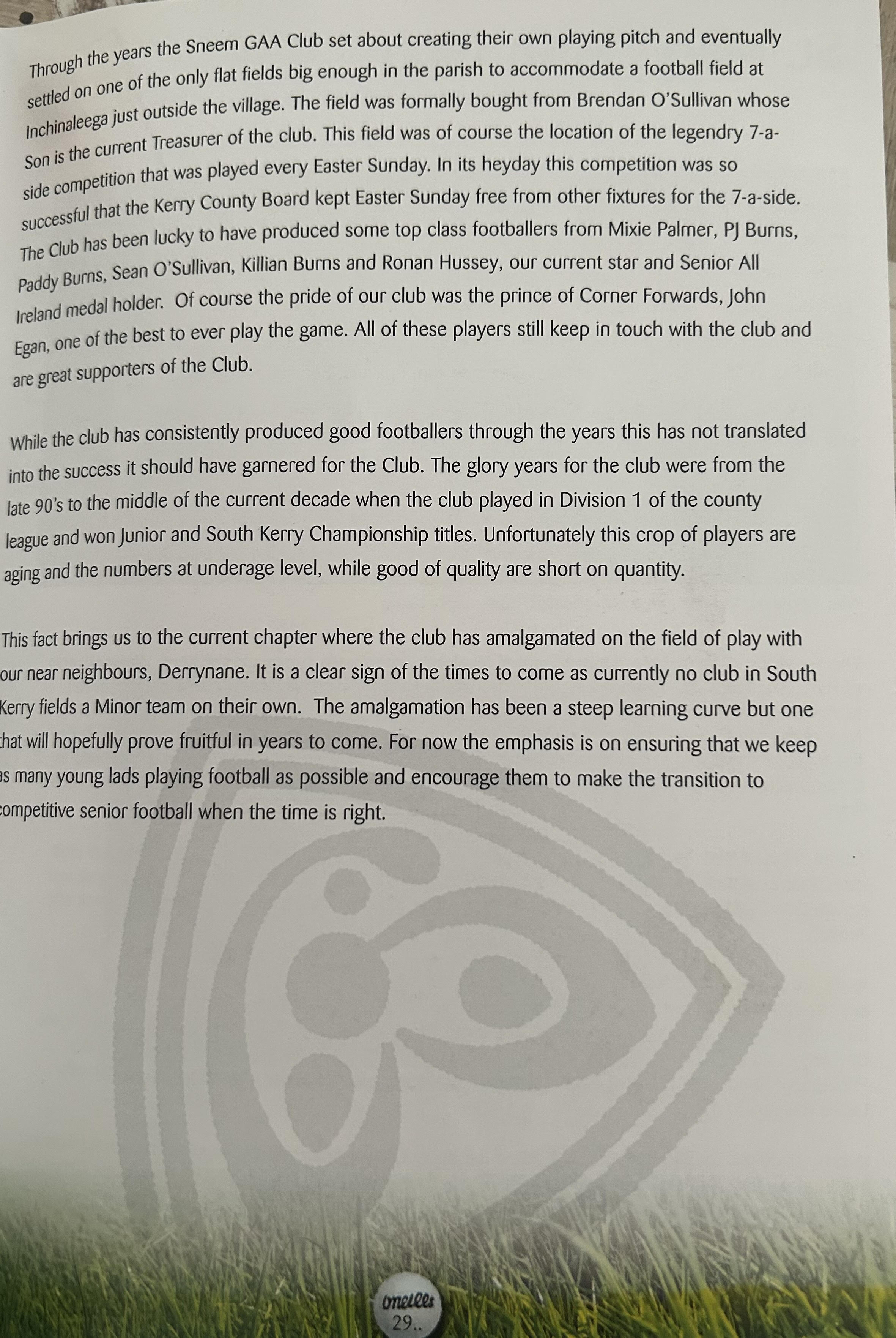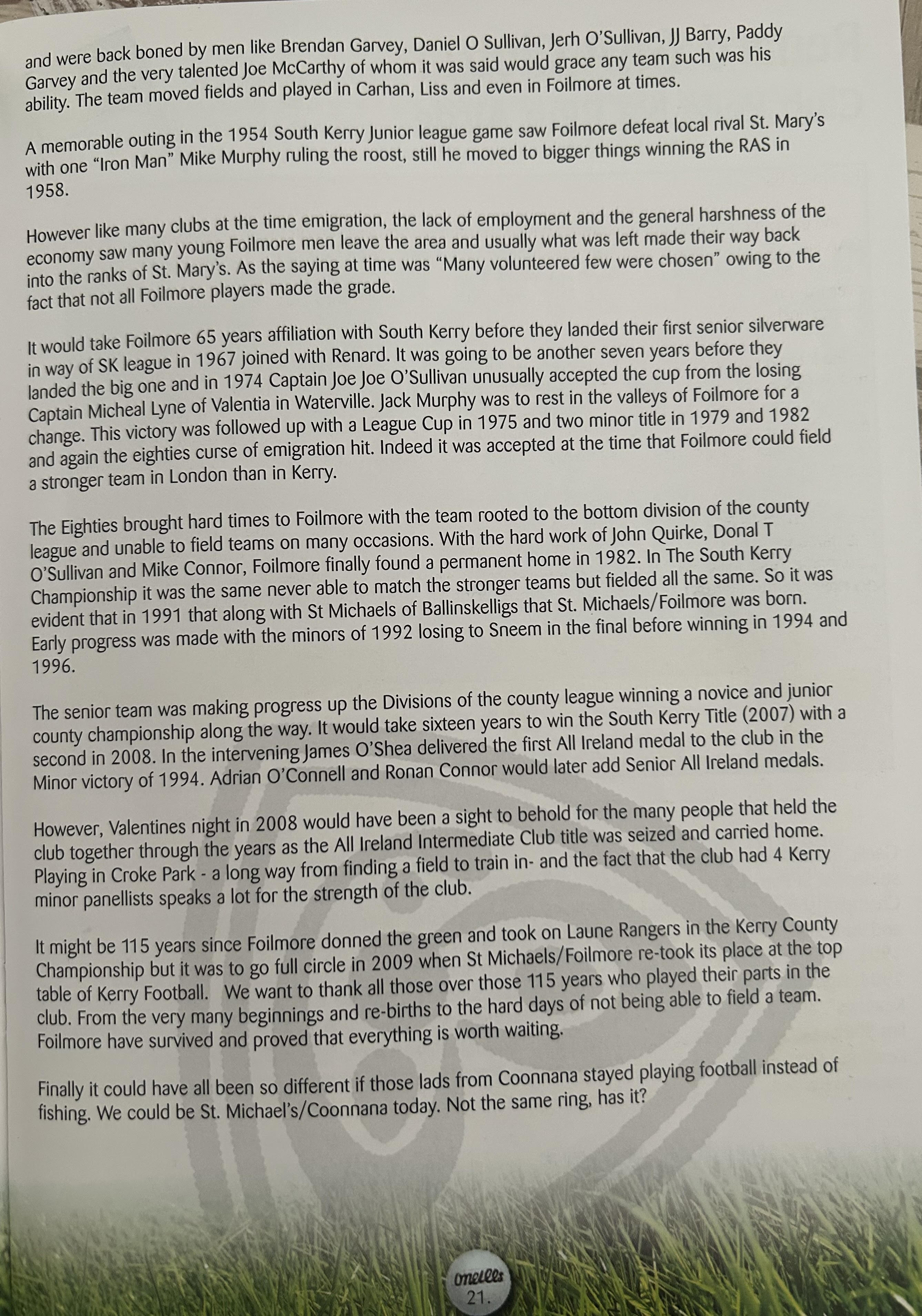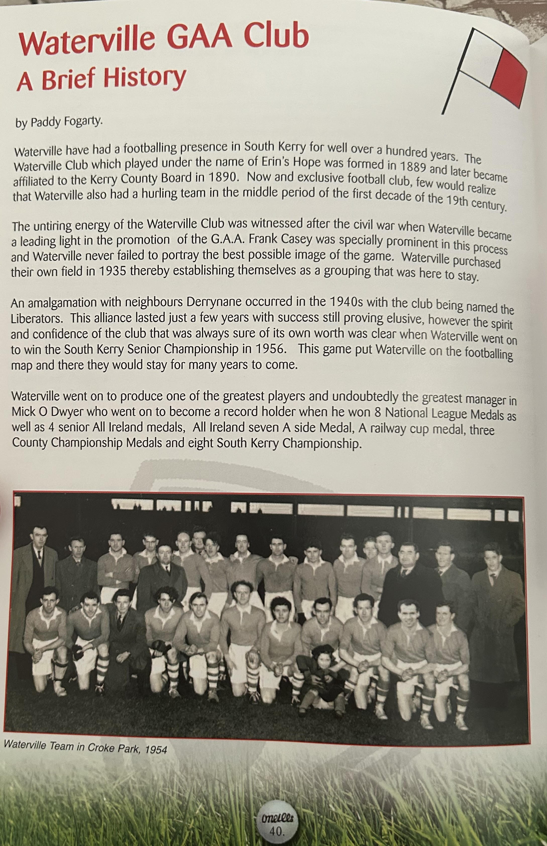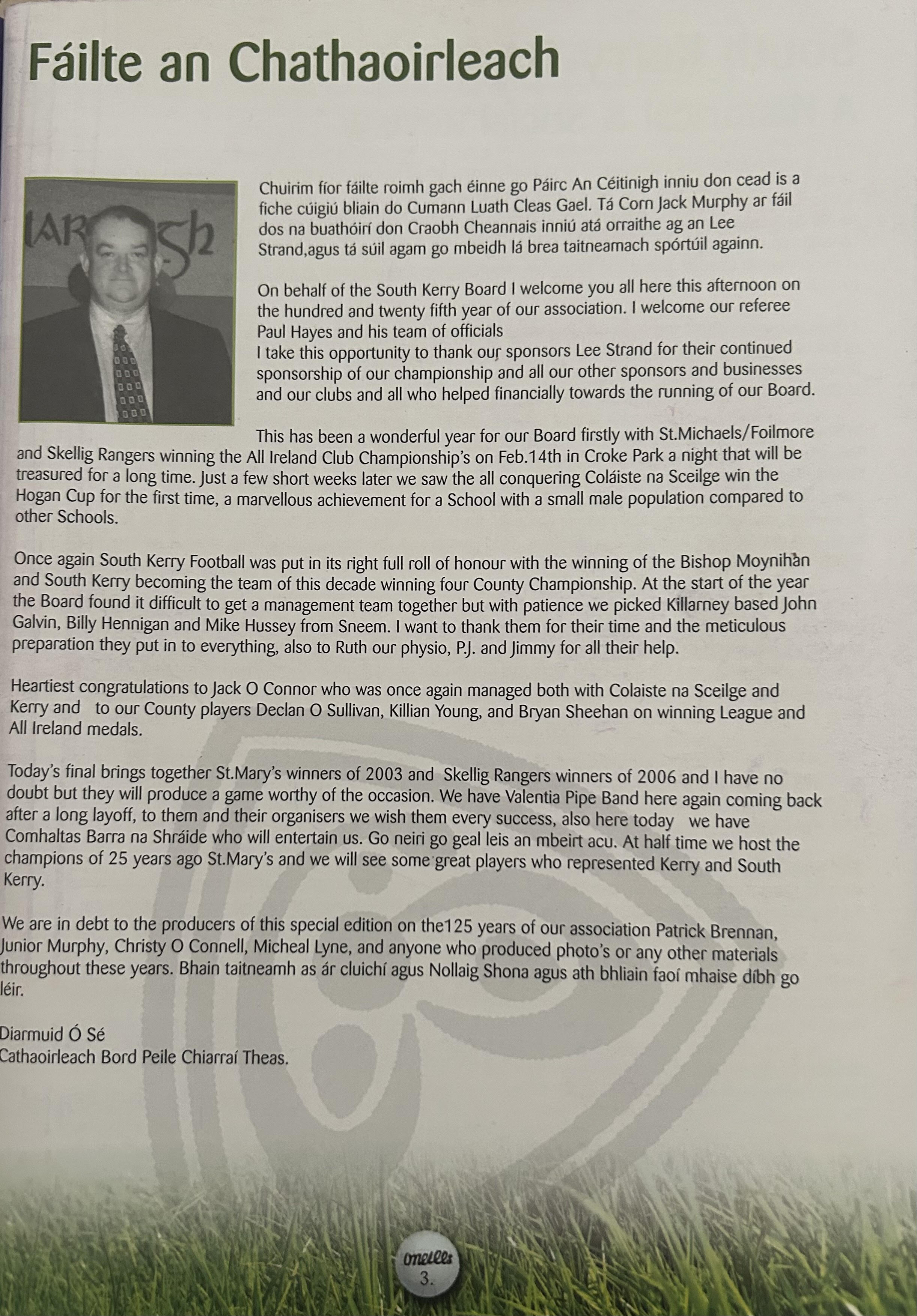 SKELLIG RANGERS: Mike Brennan, Colm Martin, Wayne O Sullivan, Seamus O Sullivan, Colin 0′ Sullivan(0-1). Christopher 0 Driscoll, Stephen L 0′ Sullivan, Stephen 0 Sulivan, Aidan 0 Sullivan (0. 1), John 0’Driscoll ,Brian Hickey ,Dan 0 Sullivan (0-2F) Bernard Casey (0- 1). Gary 0 Driscoll Sean Courtney (0-4,2F) Subs Ciaran Keating for Casey and Brendan 0′ Sullivan for John O Driscoll