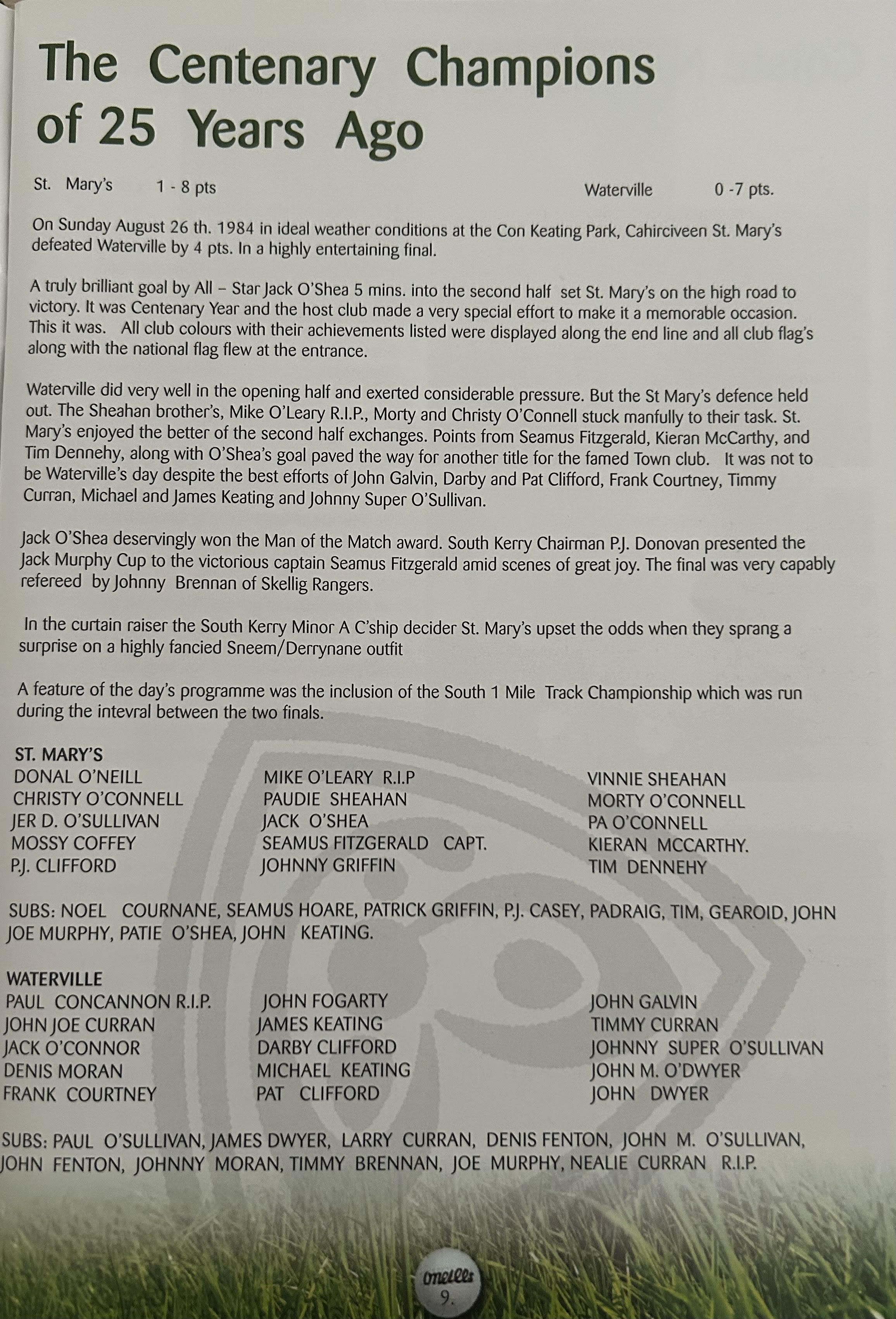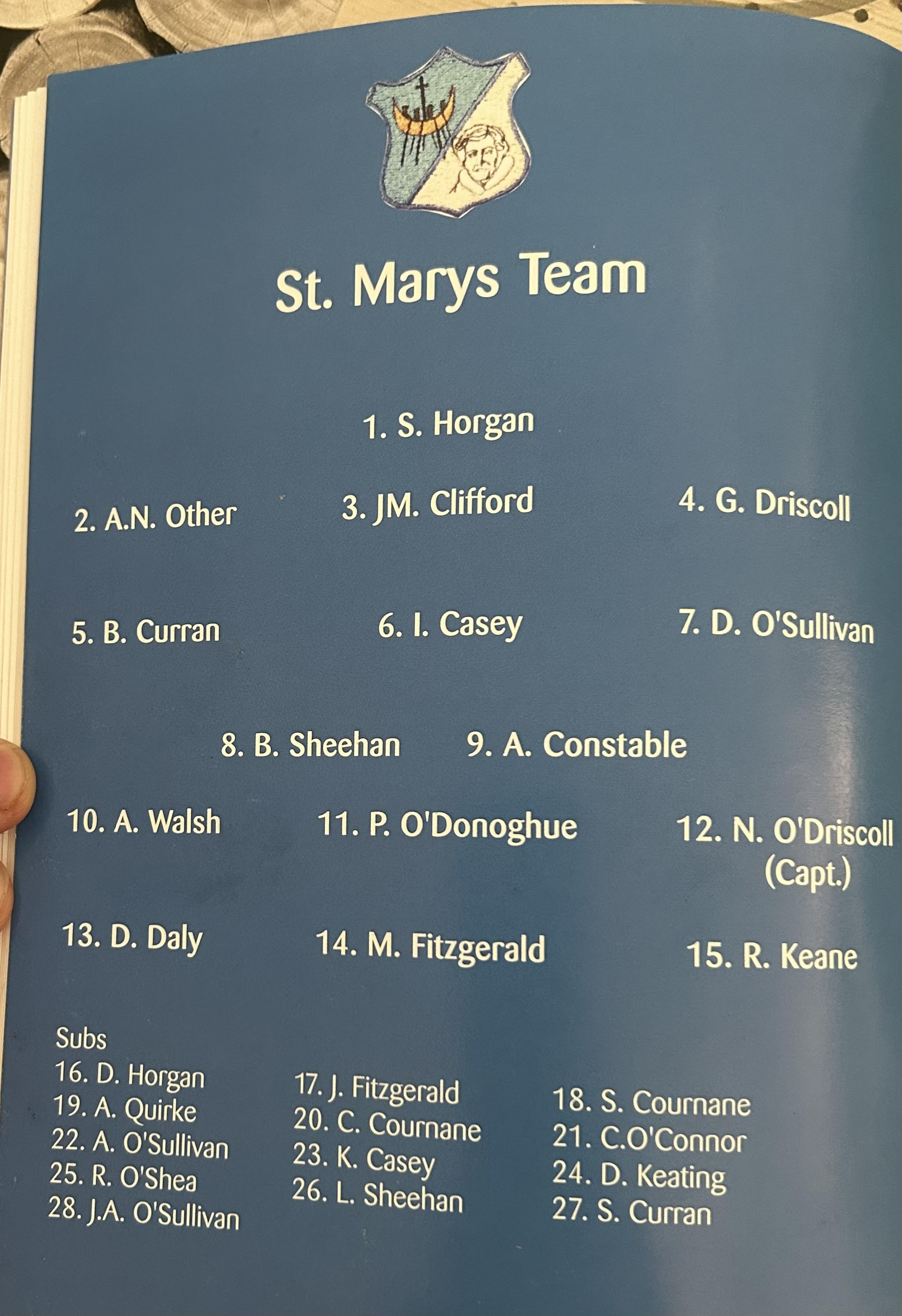 ST MARYS: Shane Hargan James Fitzperald, JM Clifford, Gearaid 0 Driscoll,Brian Curran, Ian Casey, Daniel O Sullivan, Bryan Sheehan (0-1), Austin Constable(0-2) Aidan Walsh (0-3), Paul o Donoghue, Niall O Driscoll , Daniel Daly, Maurice Fitzgerald (1-1), Ray Keane. Subs Sean Coumare for James Fitzgerald and James Fitzgerald for Keane.