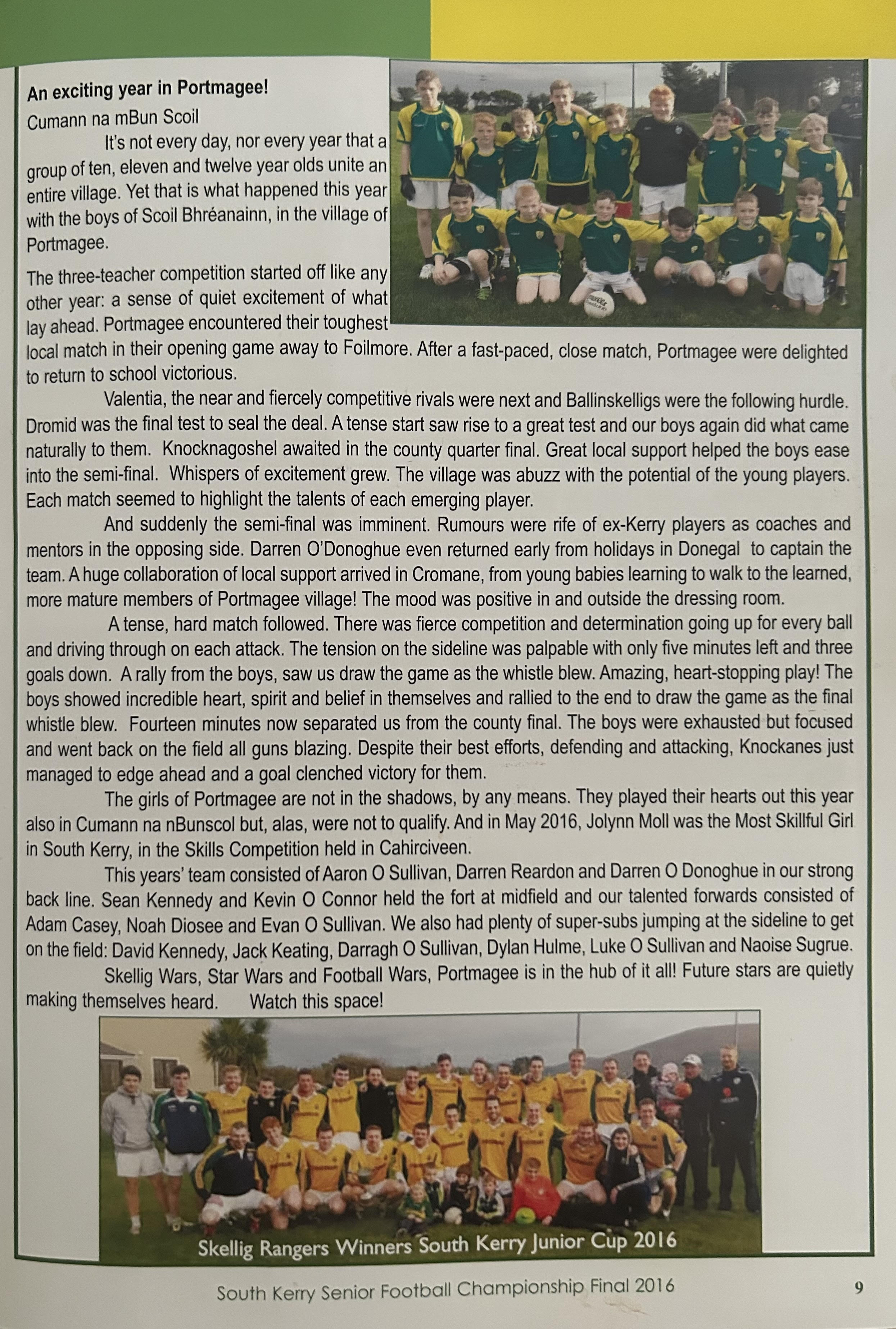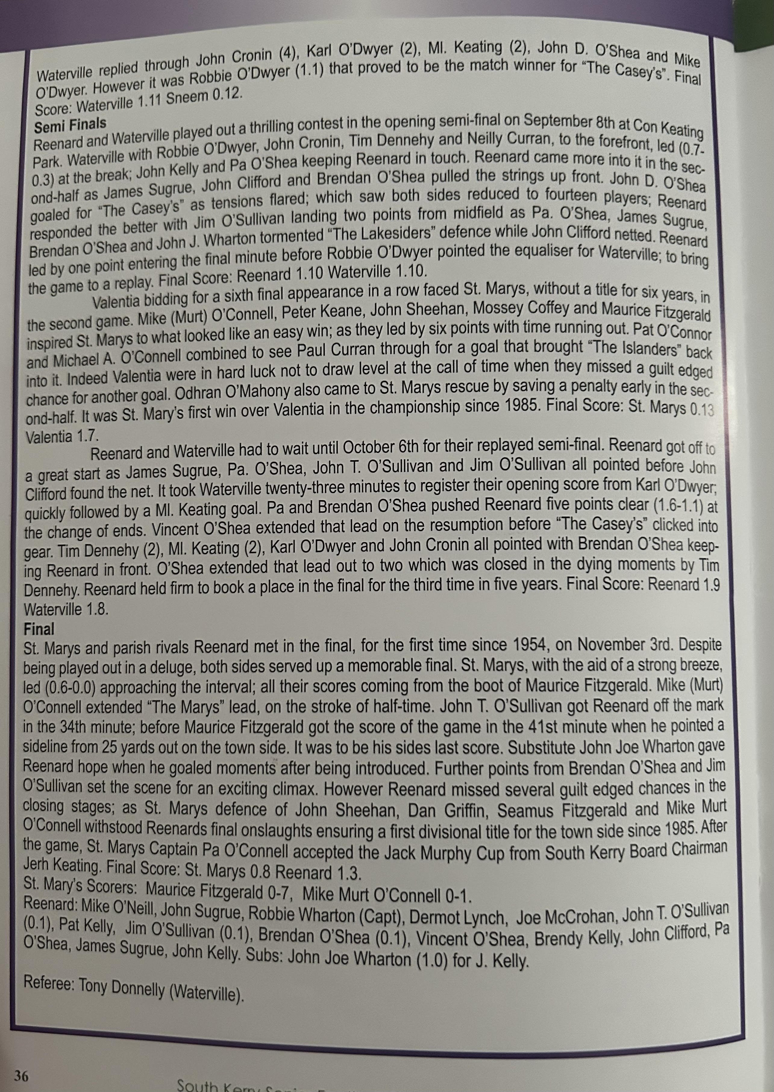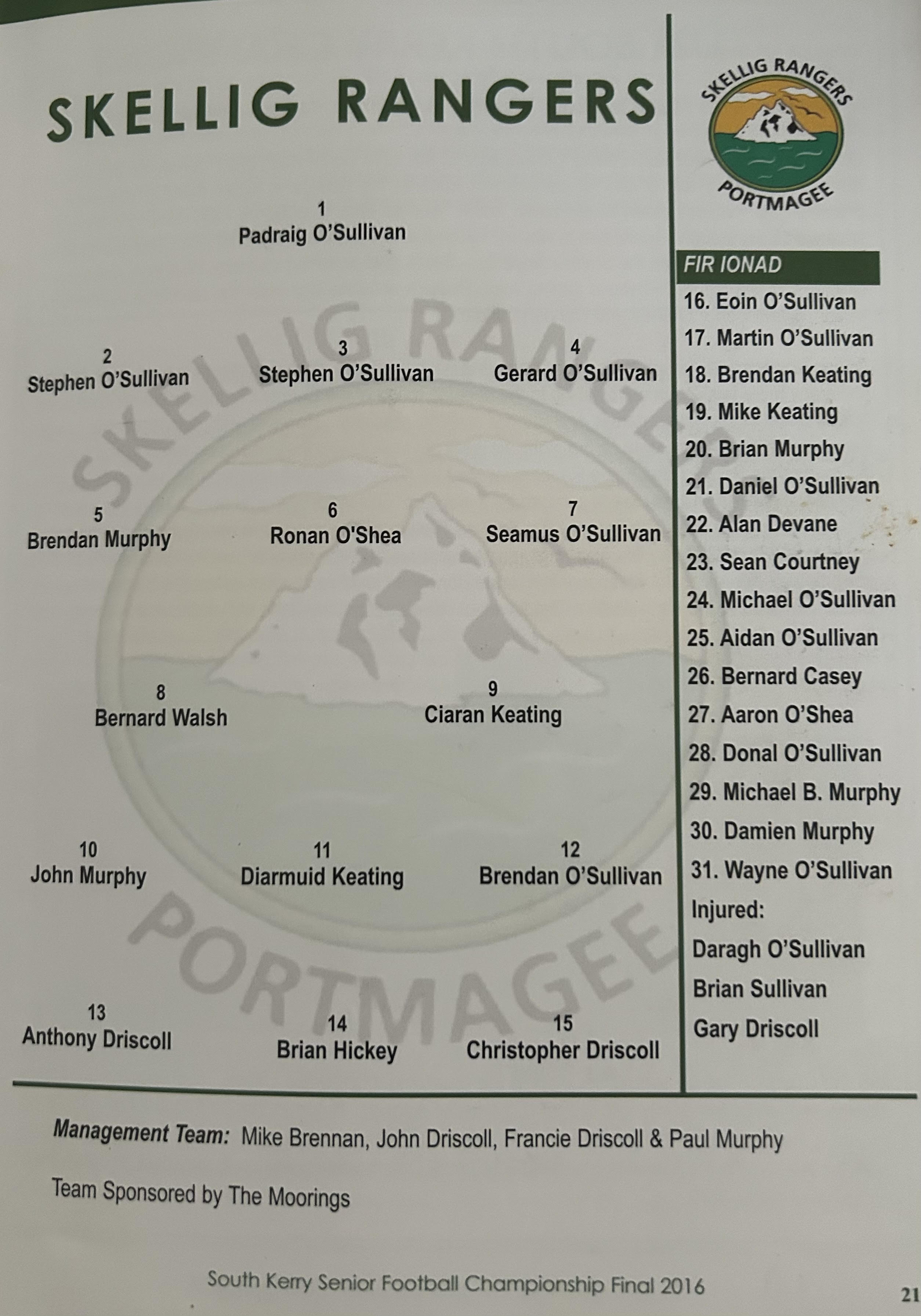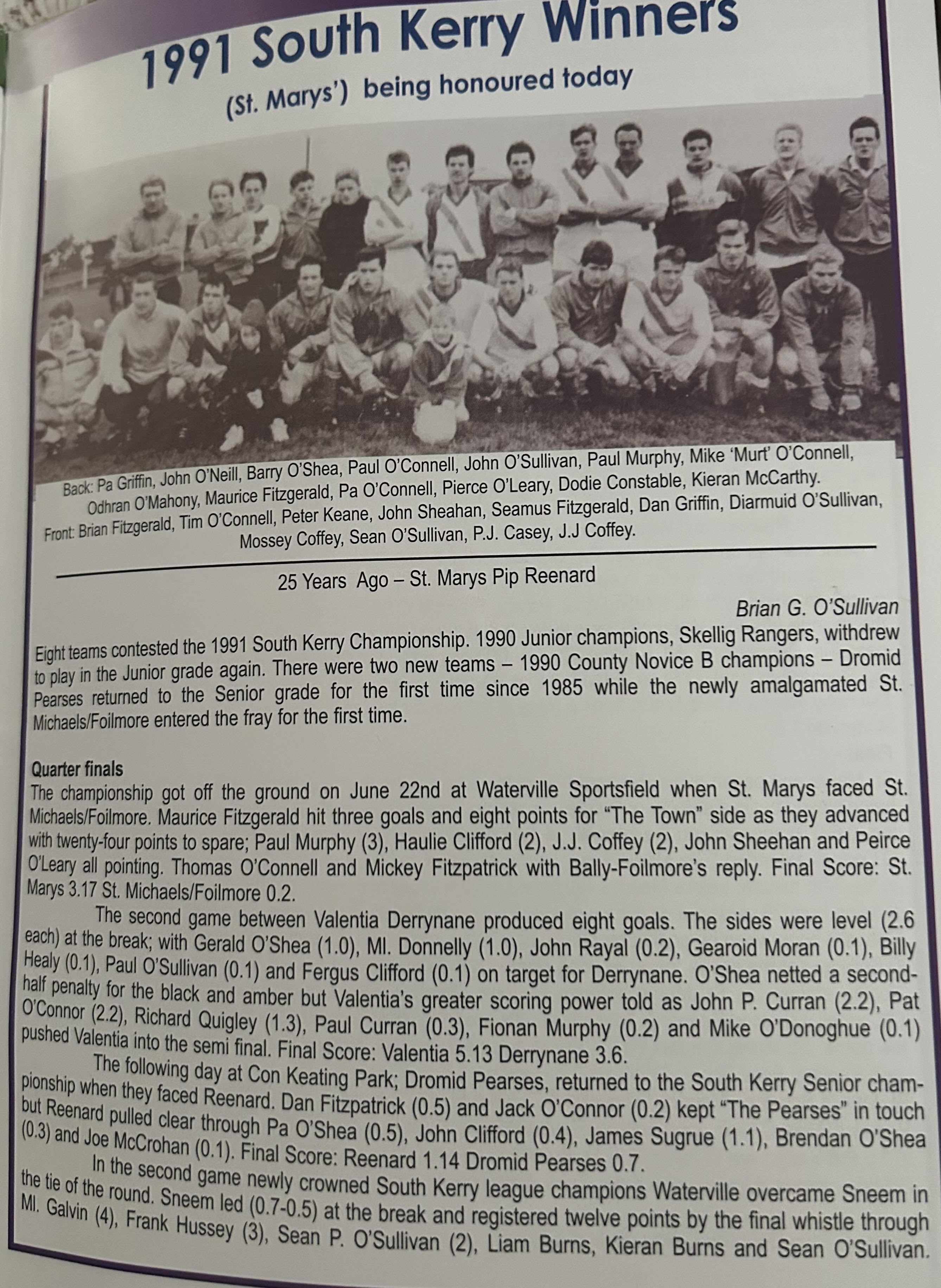 SKELLIG RANGERS: Padraig O’Sulivan, Stephen L O’Sulivan, Stephen O’Sulivan, Gerard O’Sullivan, Brendan Murphy, Bernard Walsh, Seamus O’Sullivan, Anthony ‘Driscoll, Christopher Driscoll, John Murphy, Ronan O’Shea, Brendan O’Sullivan, Diarmud Keating (1-0), Brian Hickey (0-1), Ciaran Keating (0-5, 4f). Subs: Michael O’Sullivan for J Murphy, Alan Devane for B O’Sullivan, Aiden O’Sullivan for Seamus O’Sullivan, Sean Courtney for B Hickey, Martin O’Sullivan for A Devane (B/C) Brien Murphy for C ‘Driscoll.