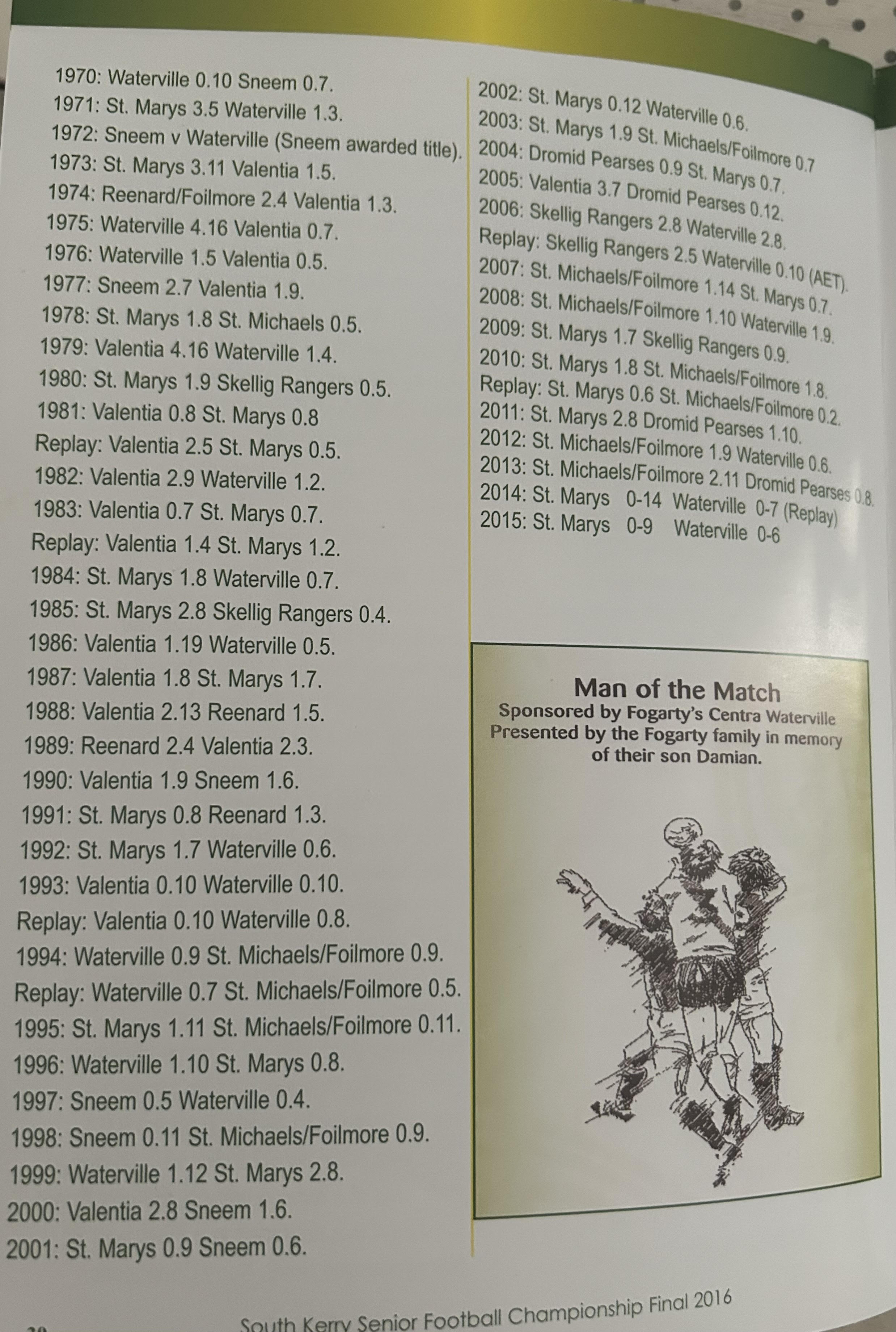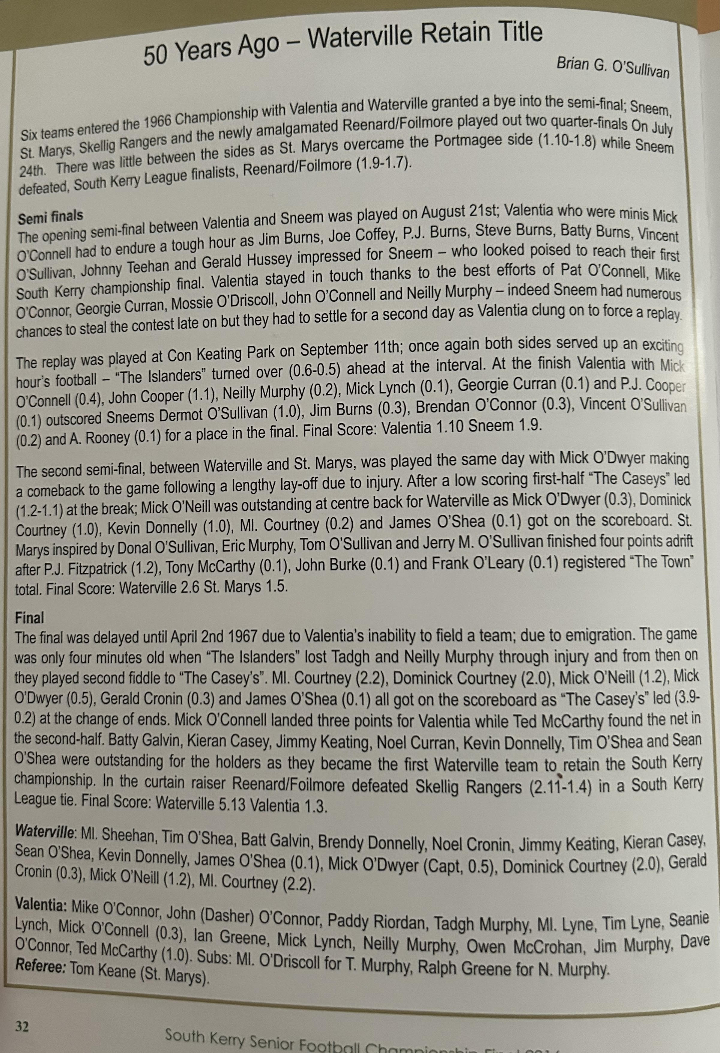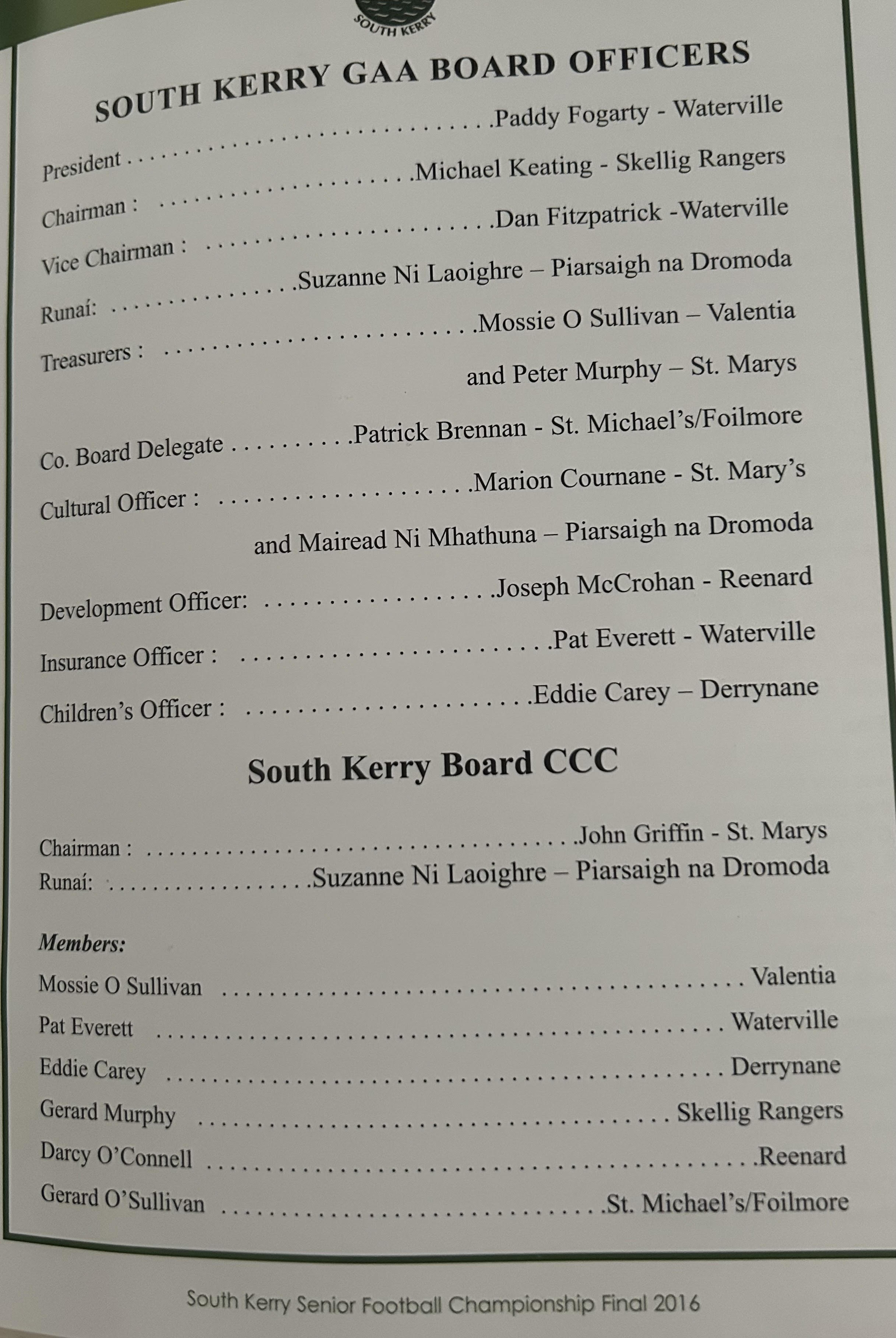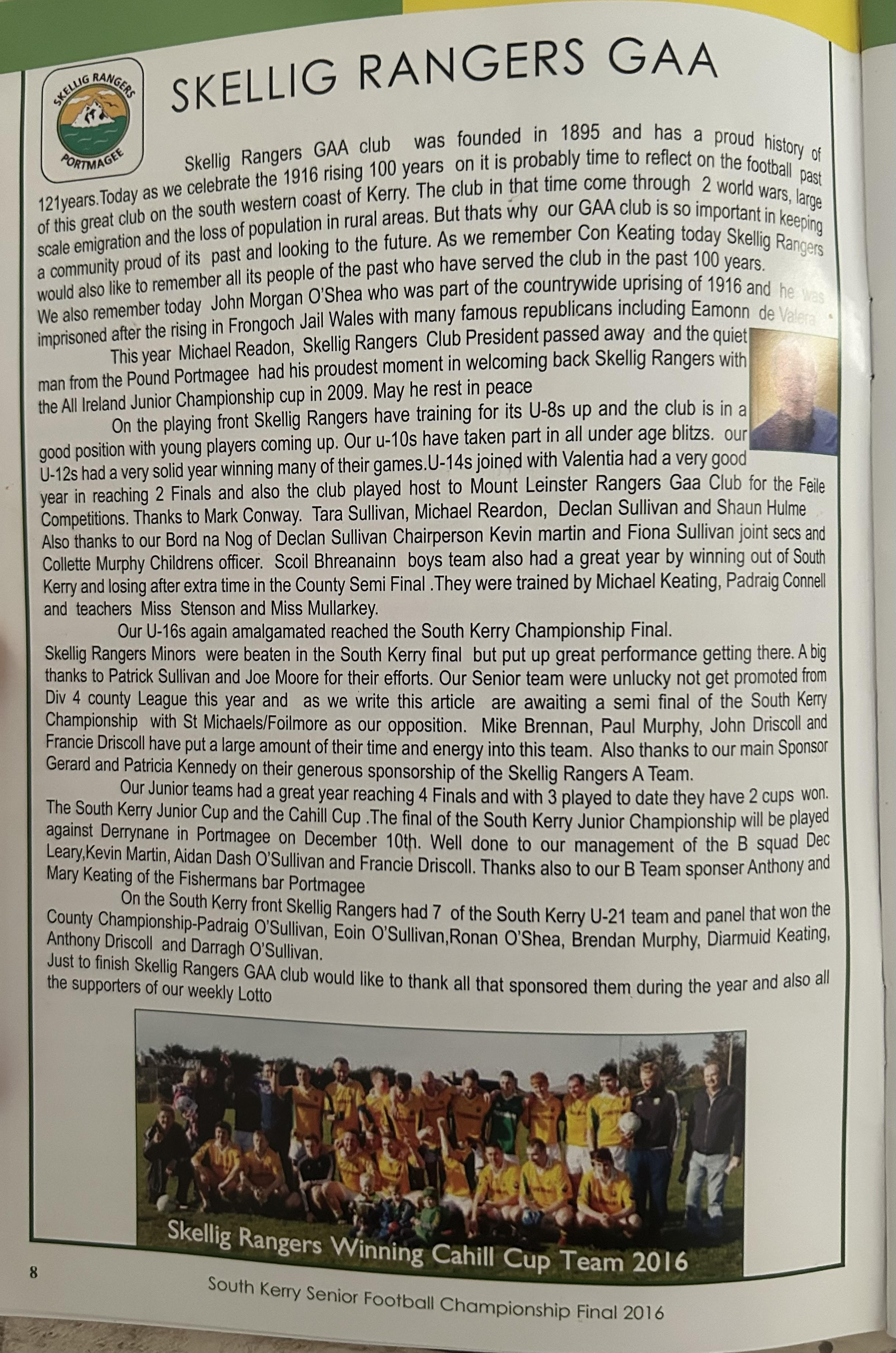 SKELLIG RANGERS: Padraig O’Sulivan, Stephen L O’Sulivan, Stephen O’Sulivan, Gerard O’Sullivan, Brendan Murphy, Bernard Walsh, Seamus O’Sullivan, Anthony ‘Driscoll, Christopher Driscoll, John Murphy, Ronan O’Shea, Brendan O’Sullivan, Diarmud Keating (1-0), Brian Hickey (0-1), Ciaran Keating (0-5, 4f). Subs: Michael O’Sullivan for J Murphy, Alan Devane for B O’Sullivan, Aiden O’Sullivan for Seamus O’Sullivan, Sean Courtney for B Hickey, Martin O’Sullivan for A Devane (B/C) Brien Murphy for C ‘Driscoll.