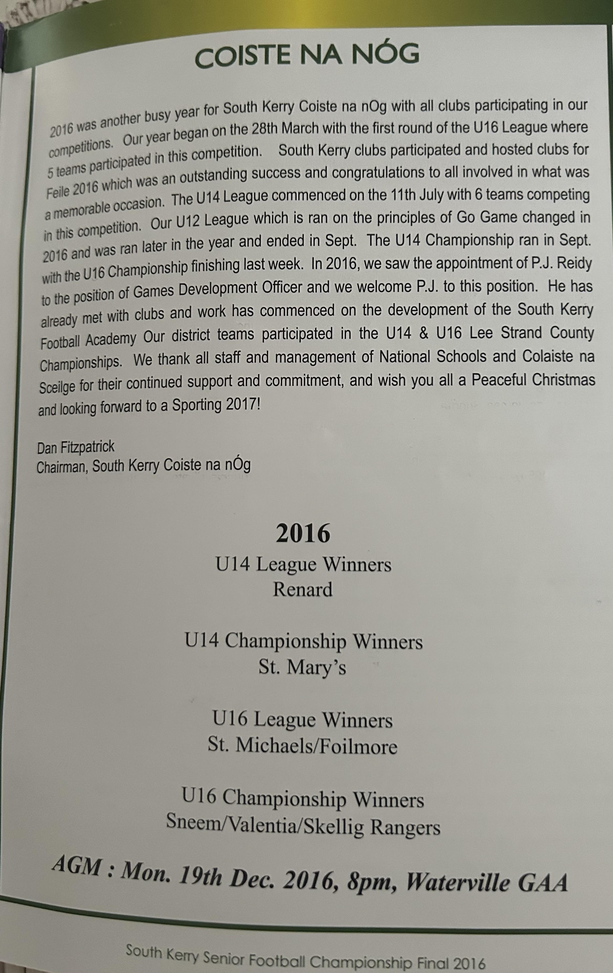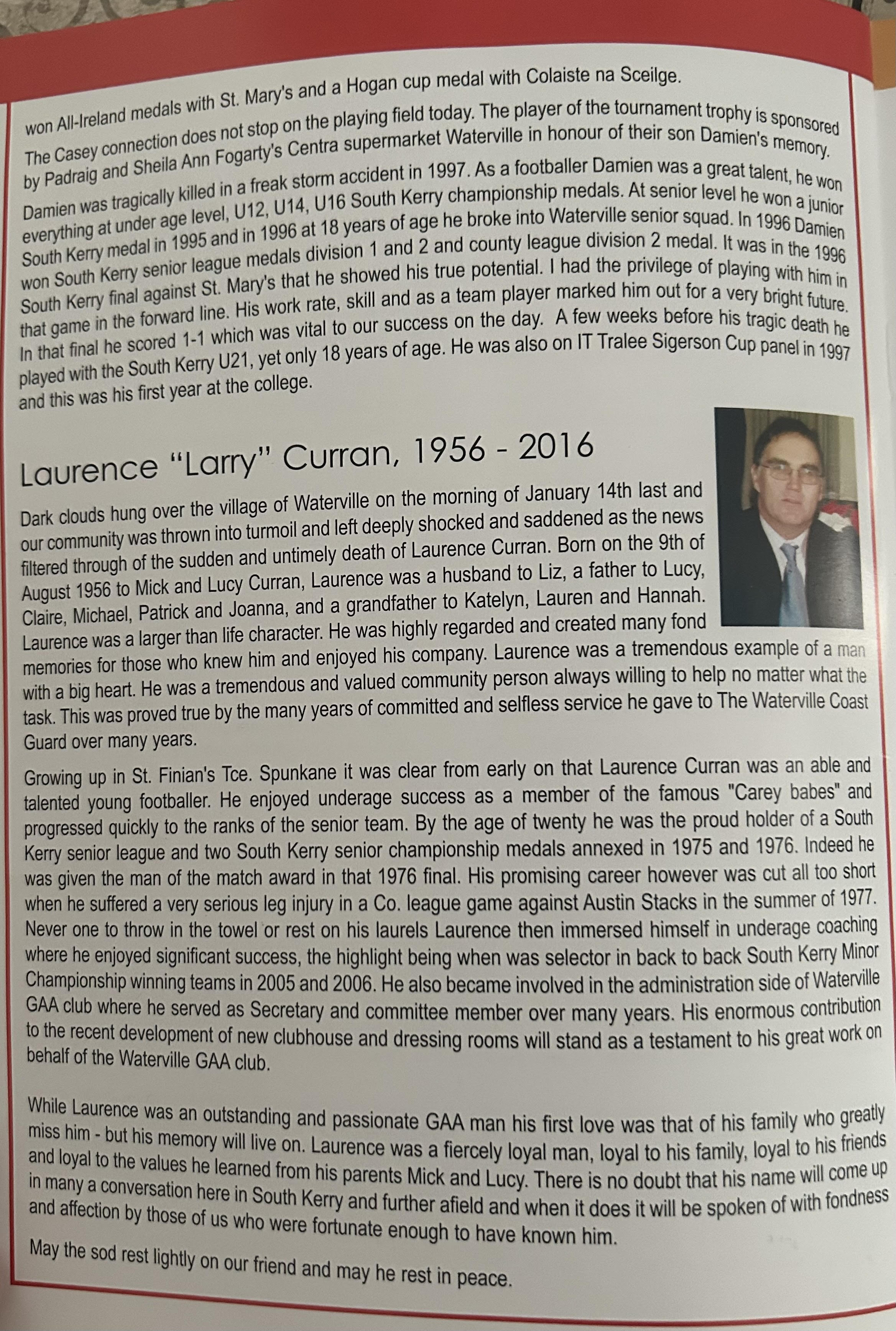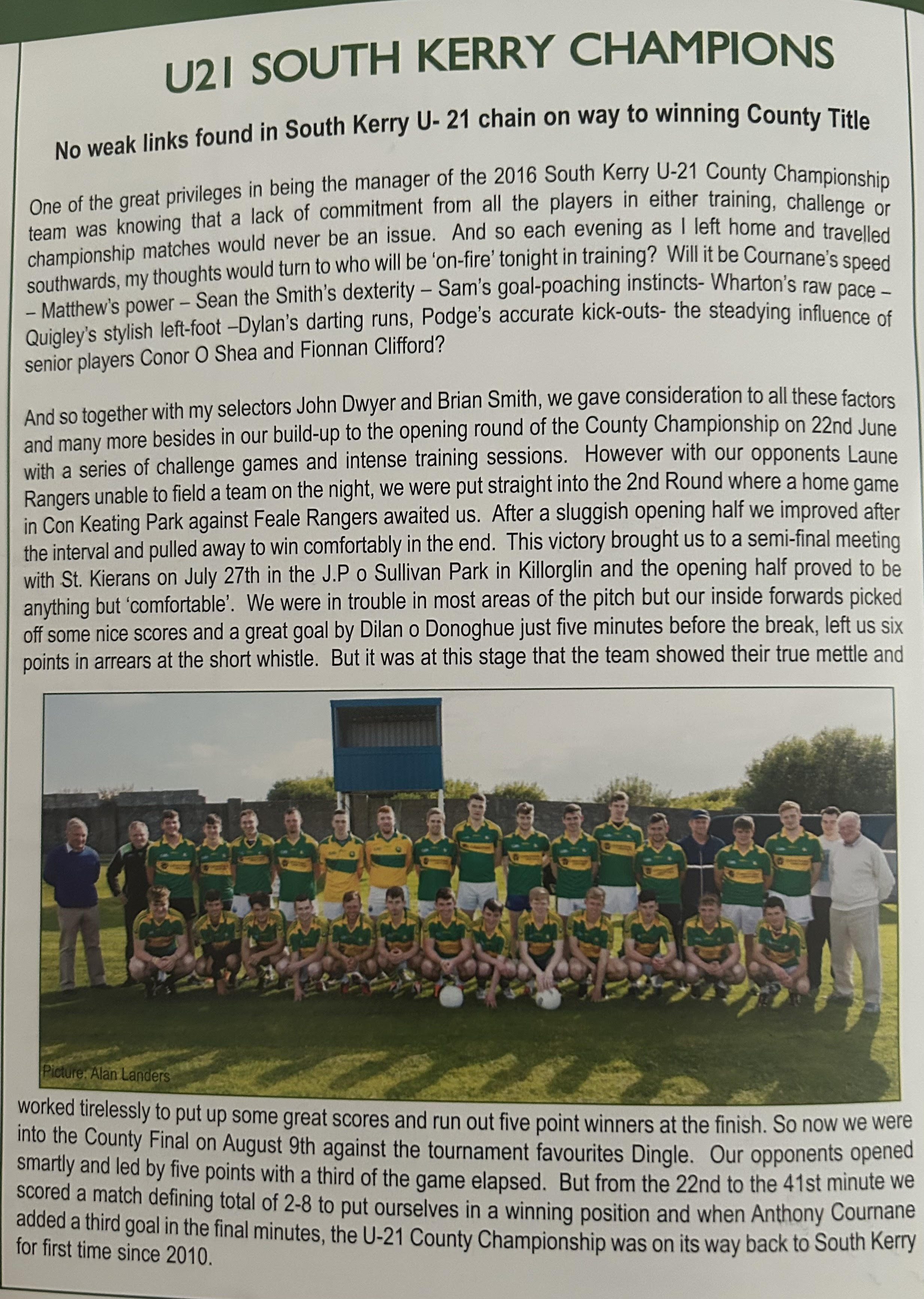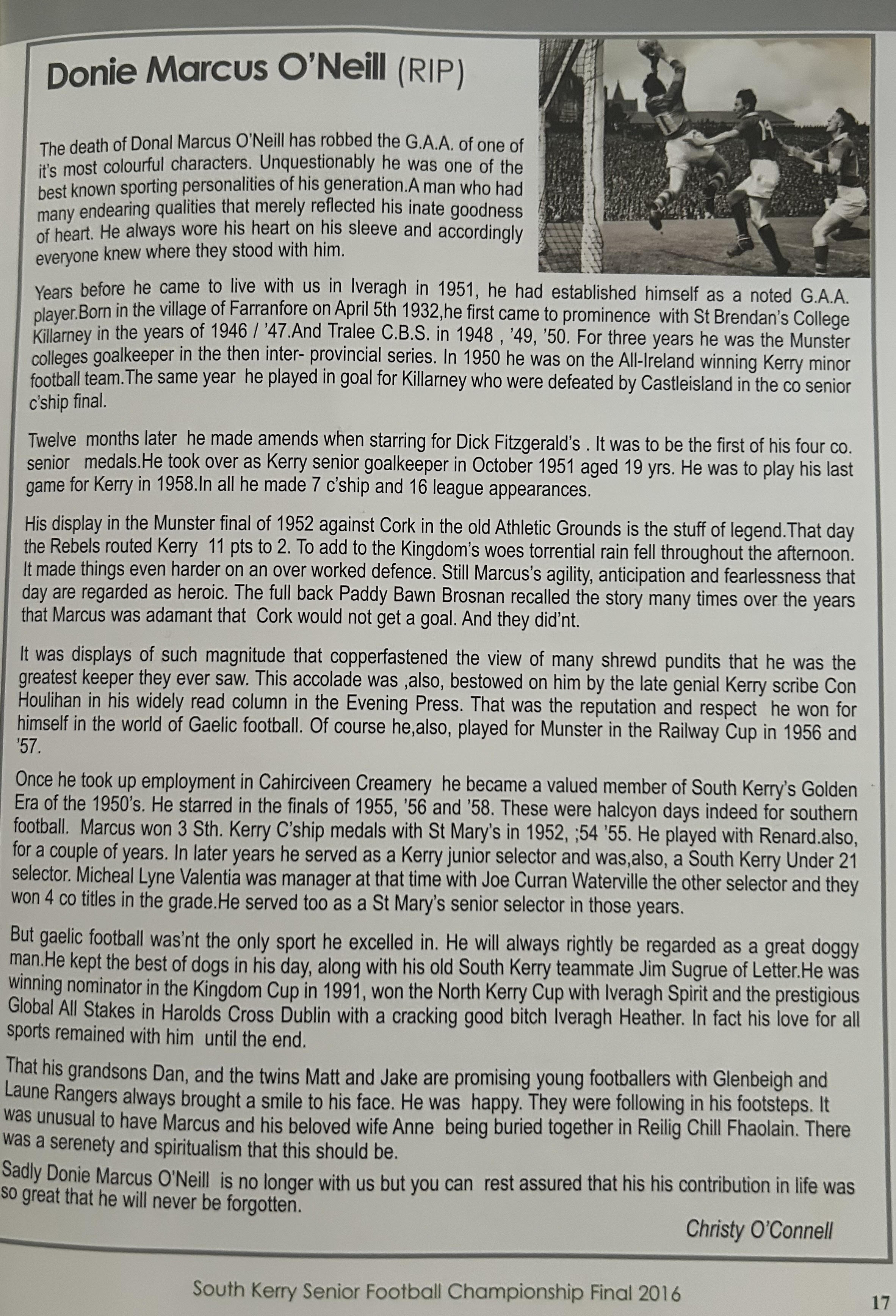 TALKING POINT: The fact that goalkeeper Austin Constable won his 10th South Kerry Championship medal. A tremendous achievement in a career that has already spanned over 20 years. Originally a prolific attacker with a cultured and productive left foot, in recent years Constable has become a number one in every sense of the word. If he does go on and singularly becomes the record holder it will be due reward for one of Cahersiveen’s greats.