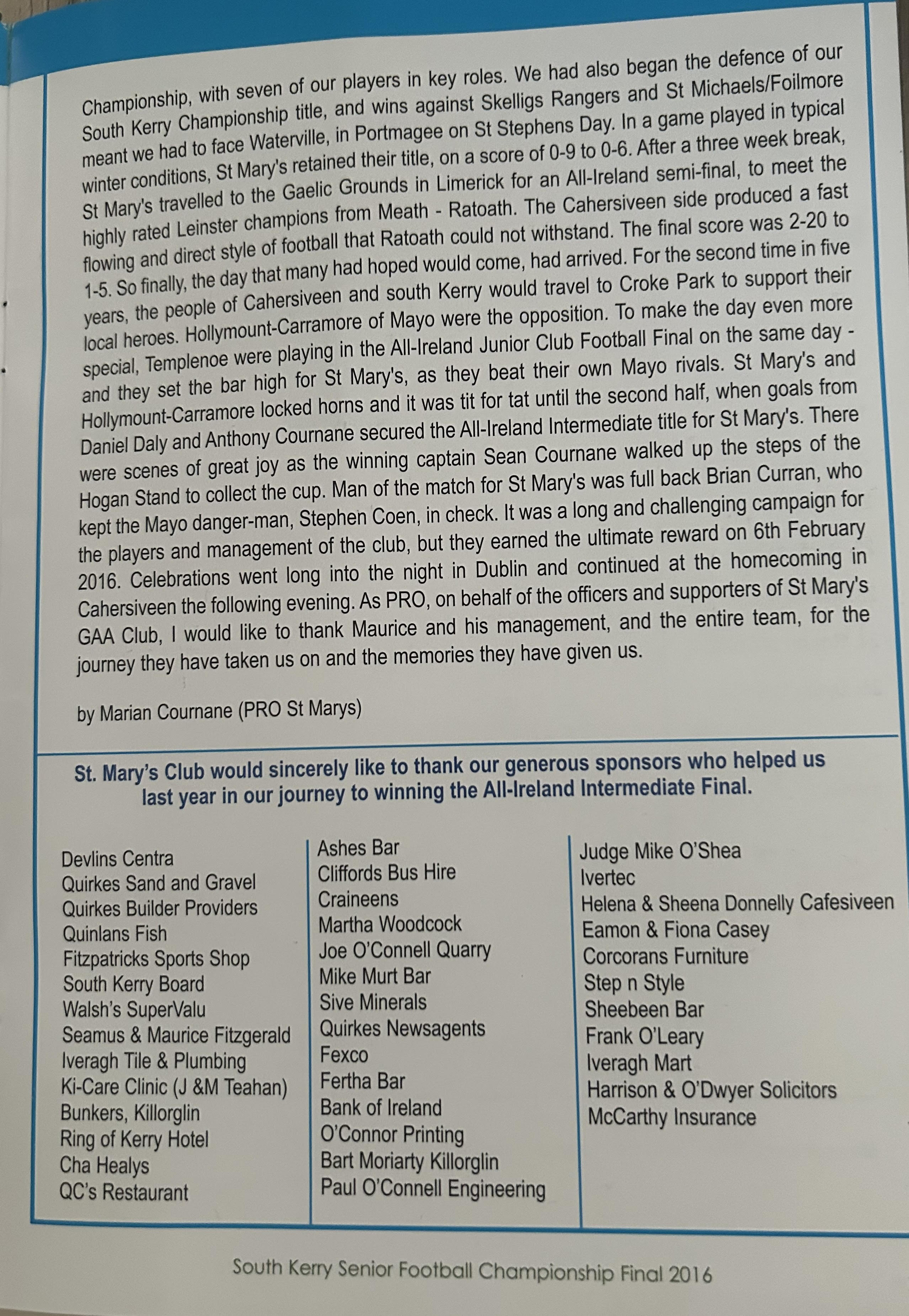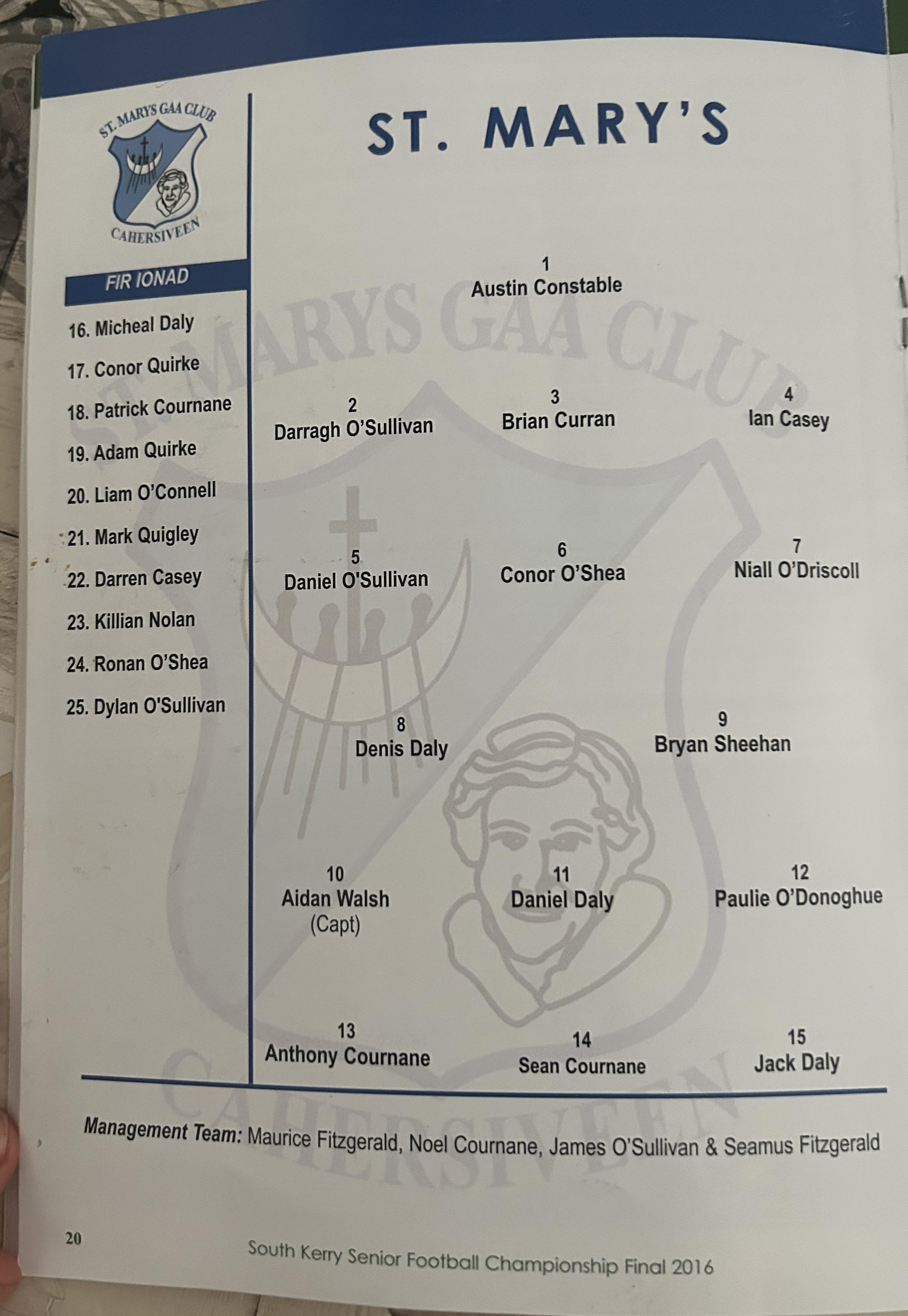 ST MARYS: Austin Constable, Derragh O’Sullivan, Brian Curran, Ian Casey, Daniel O’Sullivan, Conor O’Shea, Niall ‘Driscoll, Denis Daly (0-1), Bryan Sheehan (0-4, 3f), Aidan Welsh (0-2, Daniel Daly (0-3), Paul O’Donoghue (0-1), Anthony Cournane (1-0), Seen Cournane (0-4f), Conor Quirke. Sub: Adam Quirke for C Quirke (B/C)